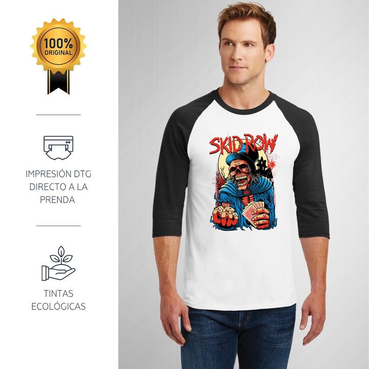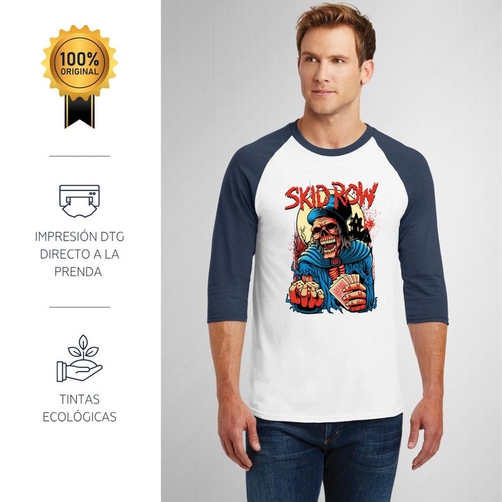 Playera de adulto raglán manga 3/4, cuello redondo para hombre nueva, diseño Rock Skid Row Esqueleto original impreso con tecnología DTG (directo a la prenda) tacto cero, uso casual o deportiva, 100% algodón pre encogido, estructura tubular sin costuras laterales. Colores de camiseta para caballero: Blanco-Negro, Blanco-Marino.