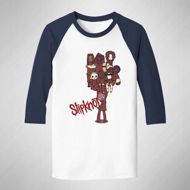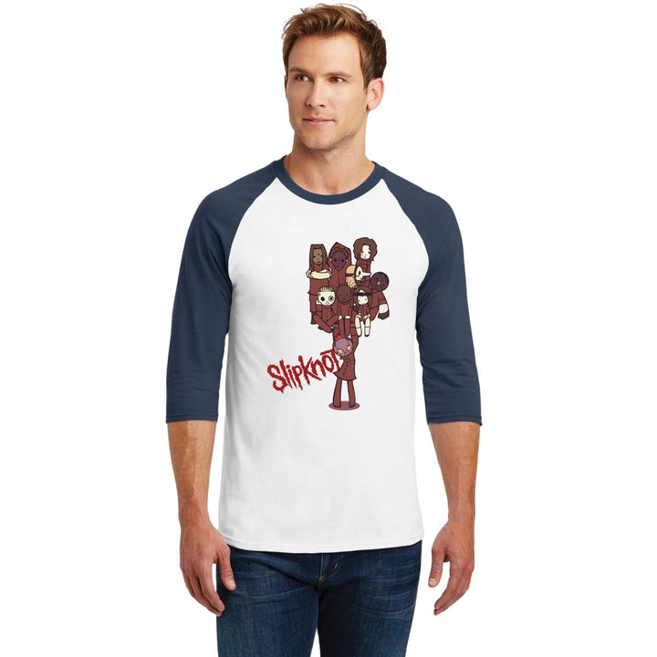 Playera de adulto raglán manga 3/4, cuello redondo para hombre nueva, diseño Rock Slipknot Máscaras original impreso con tecnología DTG (directo a la prenda) tacto cero, uso casual o deportiva, 100% algodón pre encogido, estructura tubular sin costuras laterales. Colores de camiseta para caballero: Blanco-Negro, Blanco-Marino.