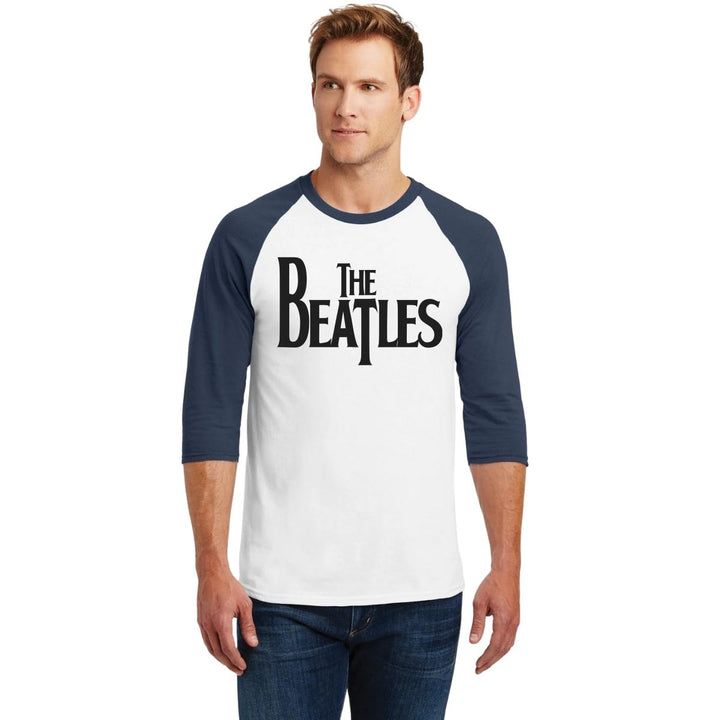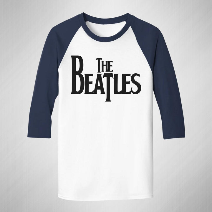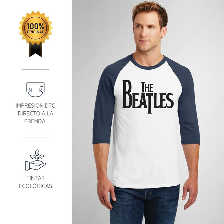 Playera de adulto raglán manga 3/4, cuello redondo para hombre nueva, diseño Rock The Beatles Logo original impreso con tecnología DTG (directo a la prenda) tacto cero, uso casual o deportiva, 100% algodón pre encogido, estructura tubular sin costuras laterales. Colores de camiseta para caballero: Blanco-Negro, Blanco-Marino.