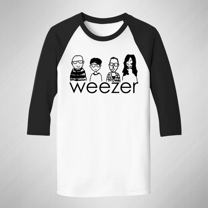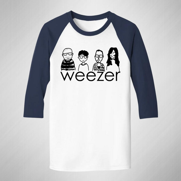 Playera de adulto raglán manga 3/4, cuello redondo para hombre nueva, diseño Rock Weezer Cartoon original impreso con tecnología DTG (directo a la prenda) tacto cero, uso casual o deportiva, 100% algodón pre encogido, estructura tubular sin costuras laterales. Colores de camiseta para caballero: Blanco-Negro, Blanco-Marino.
