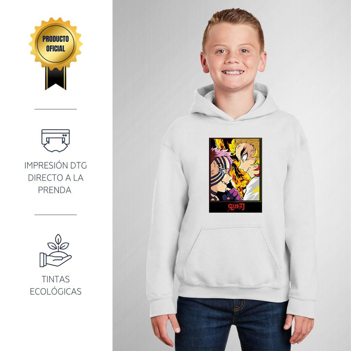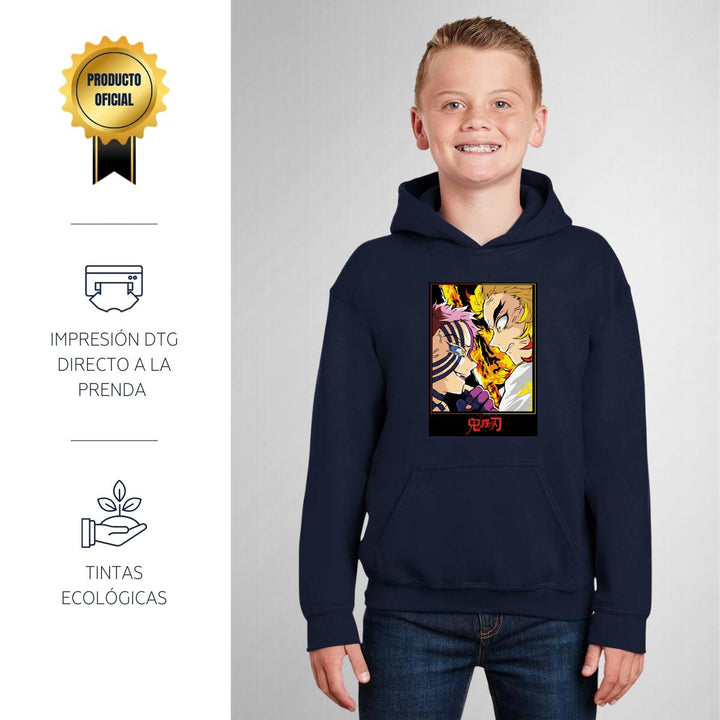 Sudadera hoodie infantil con gorro o capucha y bolsillo frontal canguro nueva, para niño o niña, diseño Anime Demon Slayer Akaza Rengoku original impreso con tecnología DTG (directo a la prenda) tacto cero, uso casual o deportiva, 50% algodón y 50% poliéster fleece pre encogido, estructura tubular con ajuste clásico. Colores de sudadera: Negro, Blanco, Azul Marino, Gris.