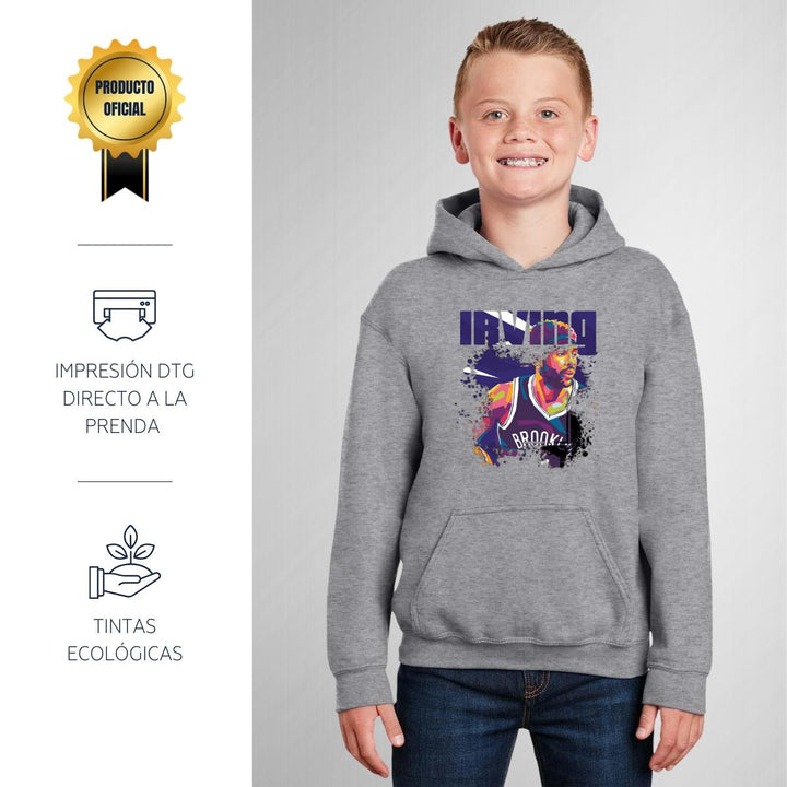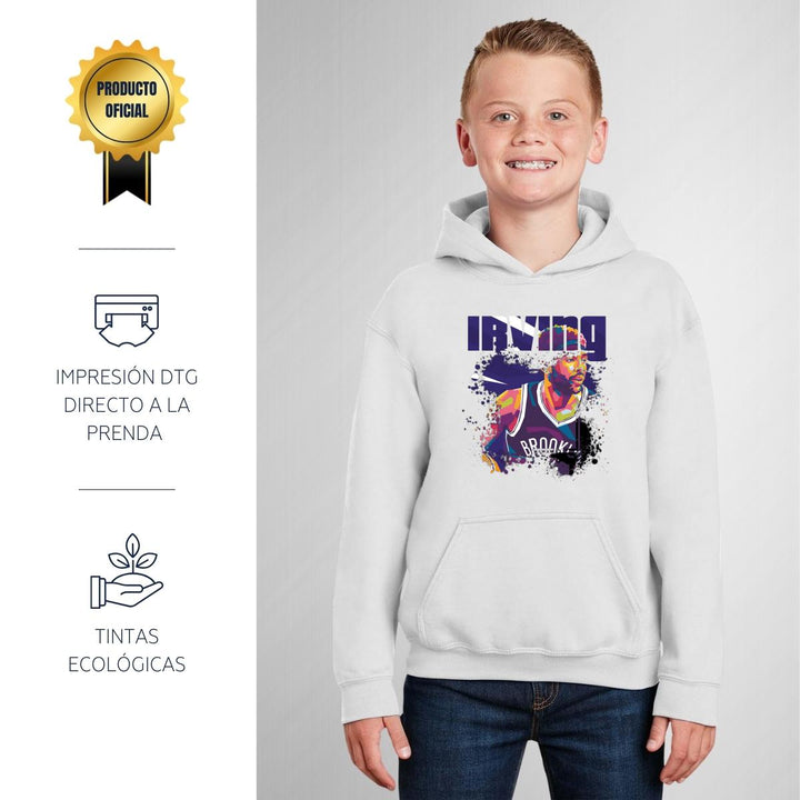 Sudadera hoodie infantil con gorro o capucha y bolsillo frontal canguro nueva, para niño o niña, diseño Kyrie Irving Basquetbolista original impreso con tecnología DTG (directo a la prenda) tacto cero, uso casual o deportiva, 50% algodón y 50% poliéster fleece pre encogido, estructura tubular con ajuste clásico. Colores de sudadera: Negro, Blanco, Azul Marino, Gris.