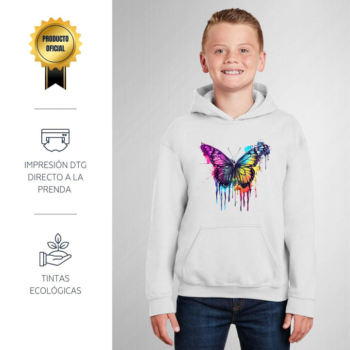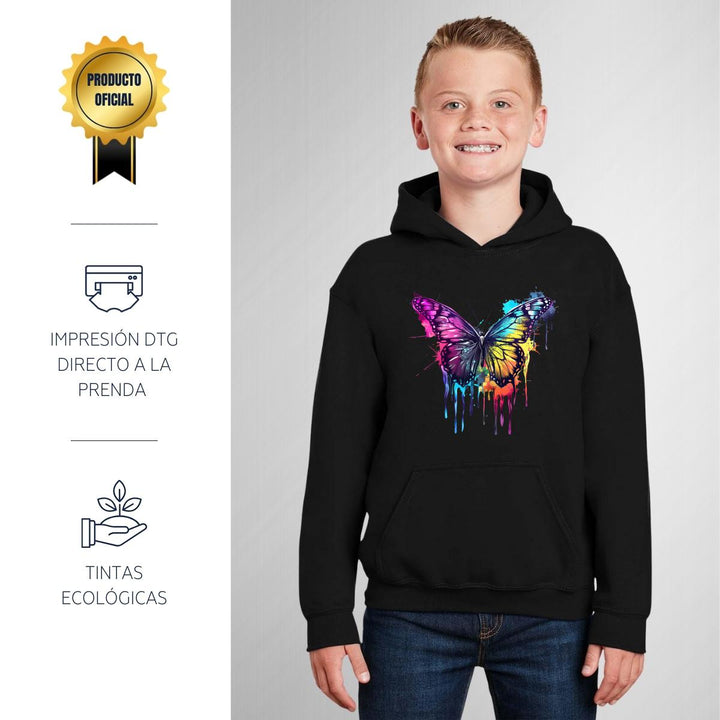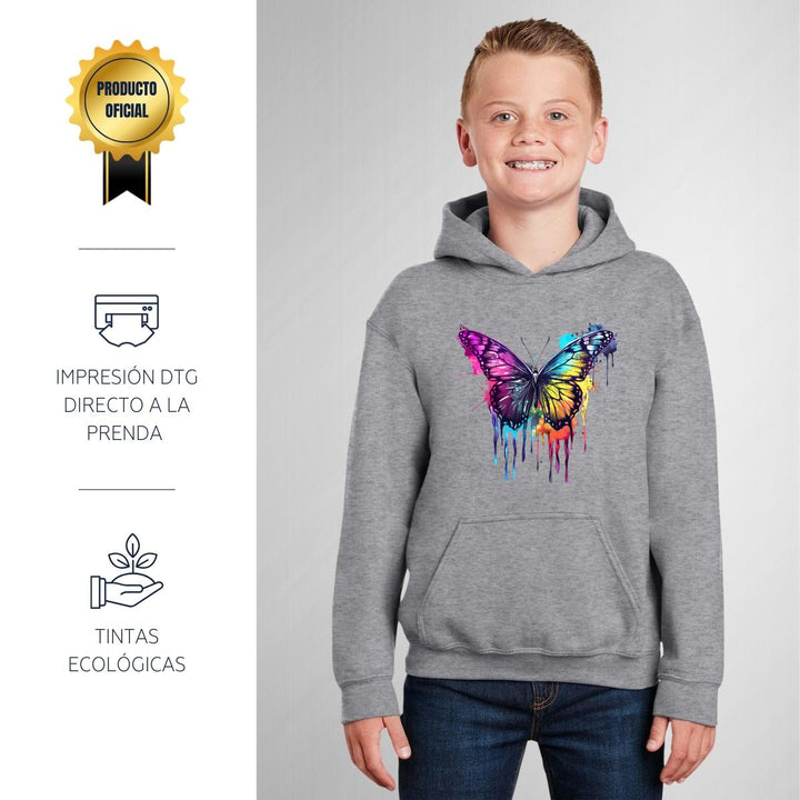 Sudadera hoodie infantil con gorro o capucha y bolsillo frontal canguro nueva, para niño o niña, diseño Mariposa Psicodélico original impreso con tecnología DTG (directo a la prenda) tacto cero, uso casual o deportiva, 50% algodón y 50% poliéster fleece pre encogido, estructura tubular con ajuste clásico. Colores de sudadera: Negro, Blanco, Azul Marino, Gris.