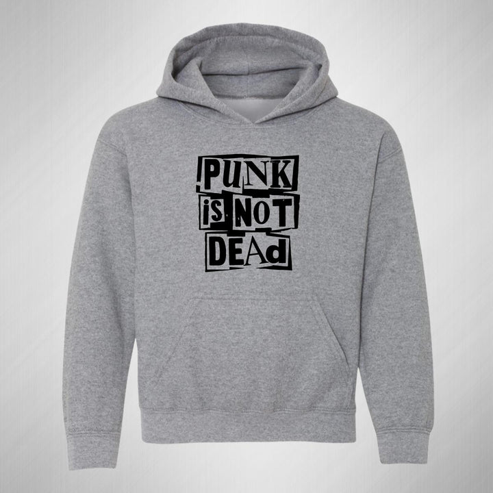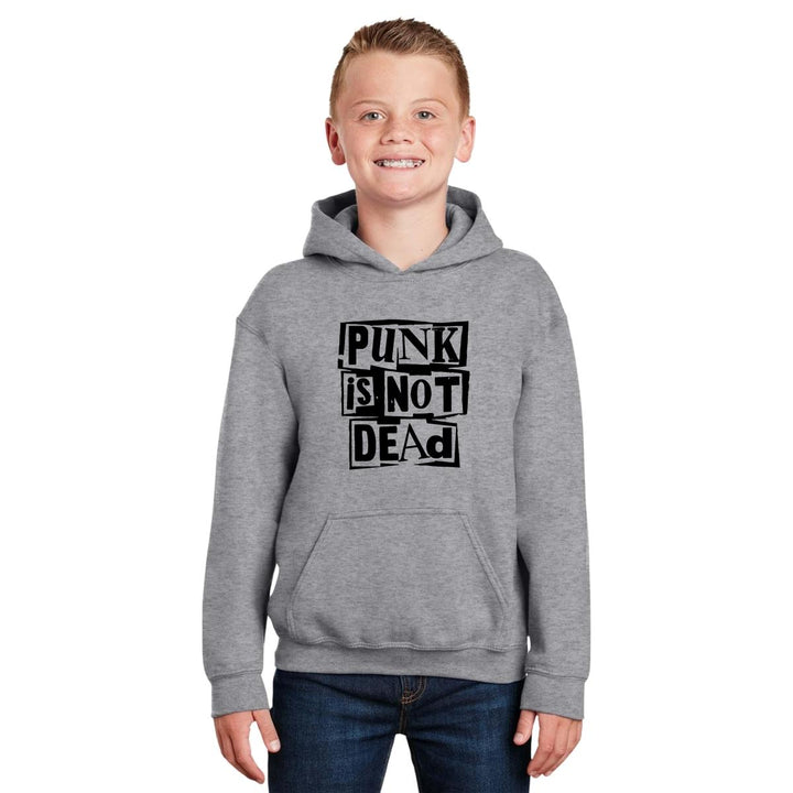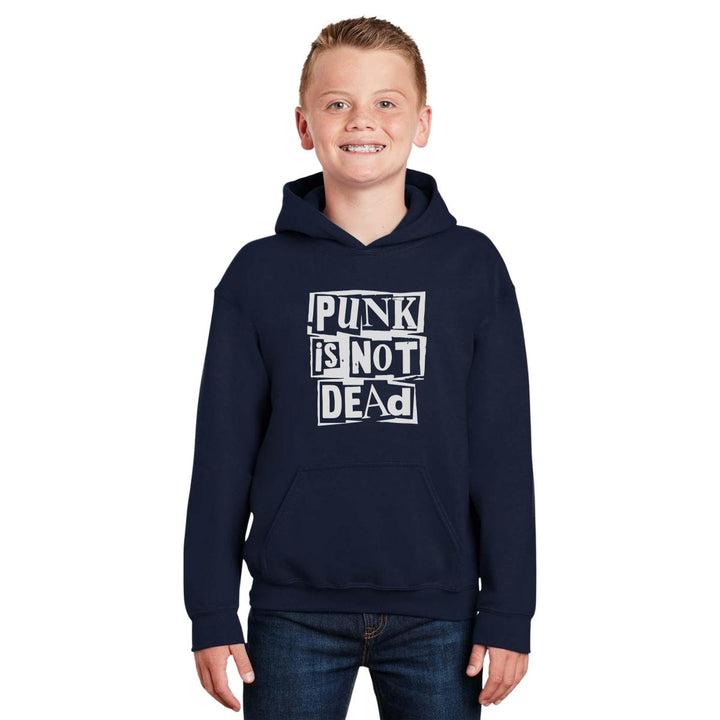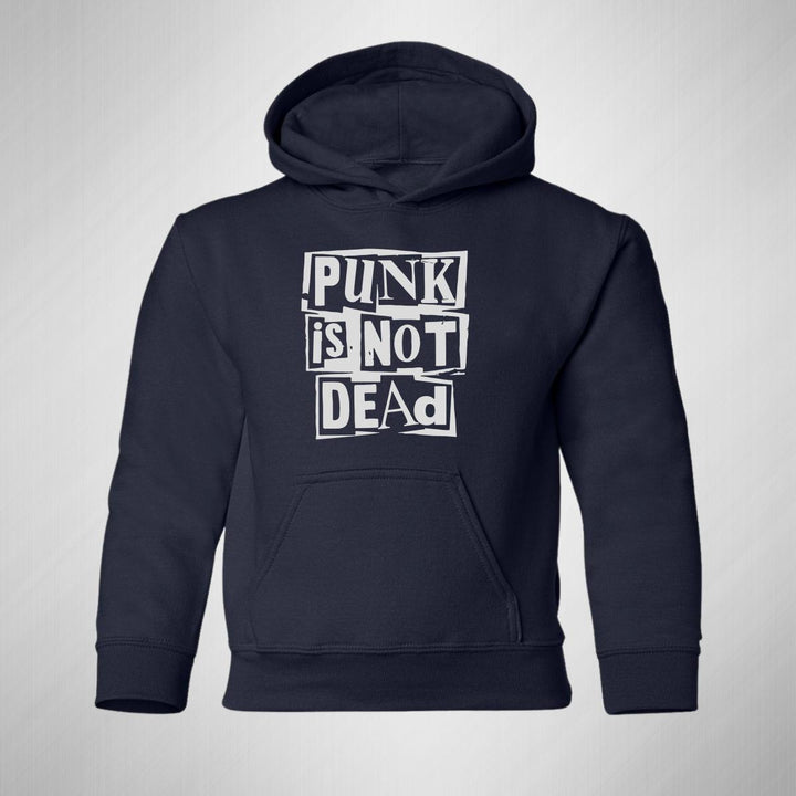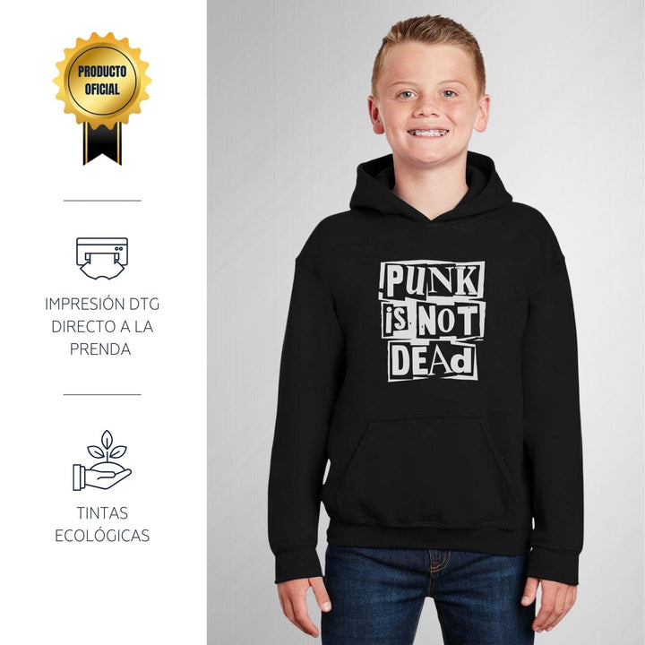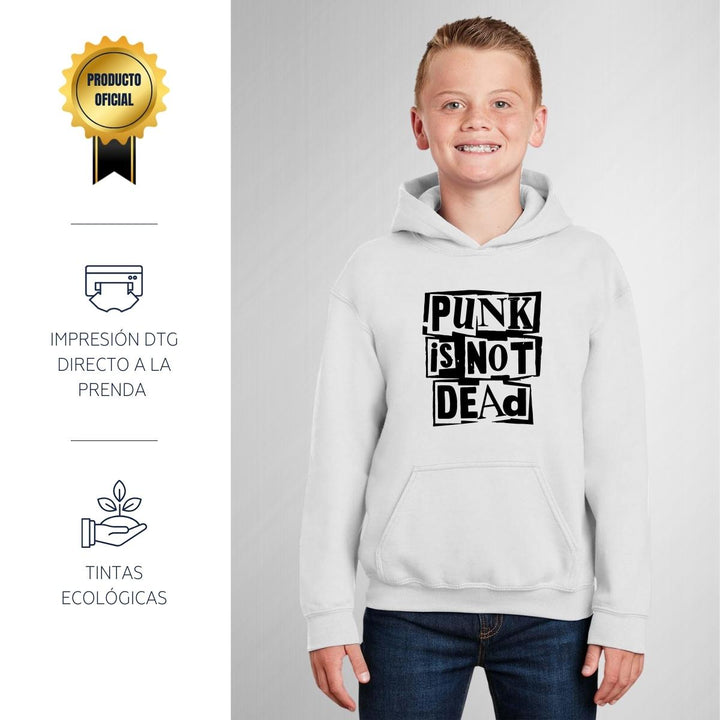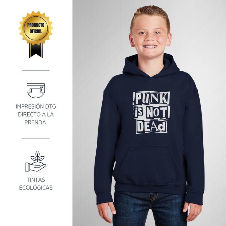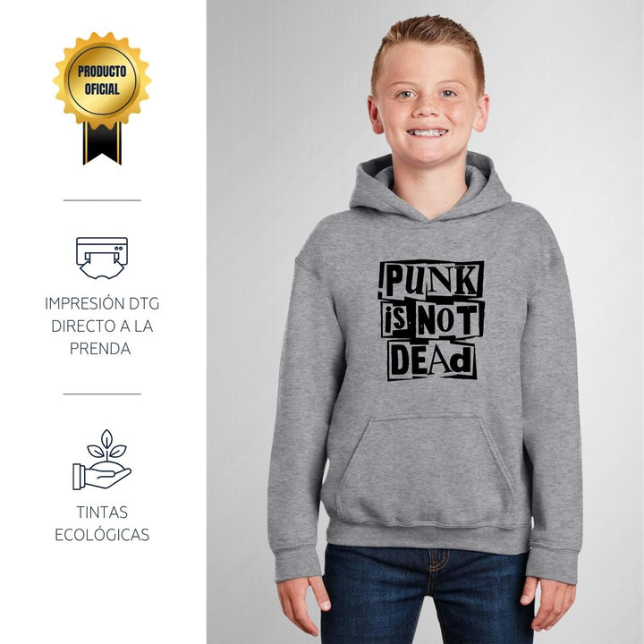 Sudadera hoodie infantil con gorro o capucha y bolsillo frontal canguro nueva, para niño o niña, diseño Rock Punk Is not dead original impreso con tecnología DTG (directo a la prenda) tacto cero, uso casual o deportiva, 50% algodón y 50% poliéster fleece pre encogido, estructura tubular con ajuste clásico. Colores de sudadera: Negro, Blanco, Azul Marino, Gris.