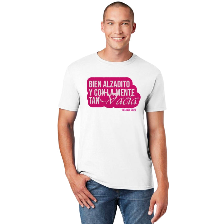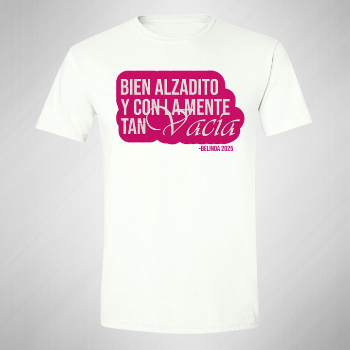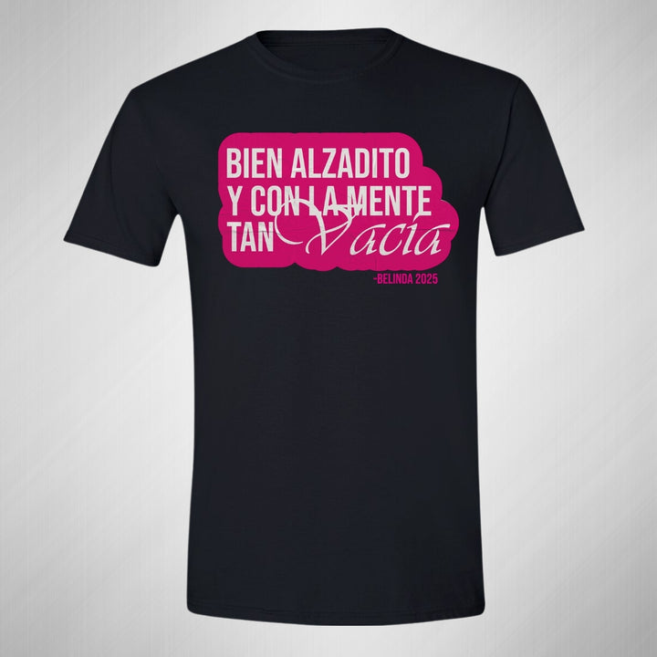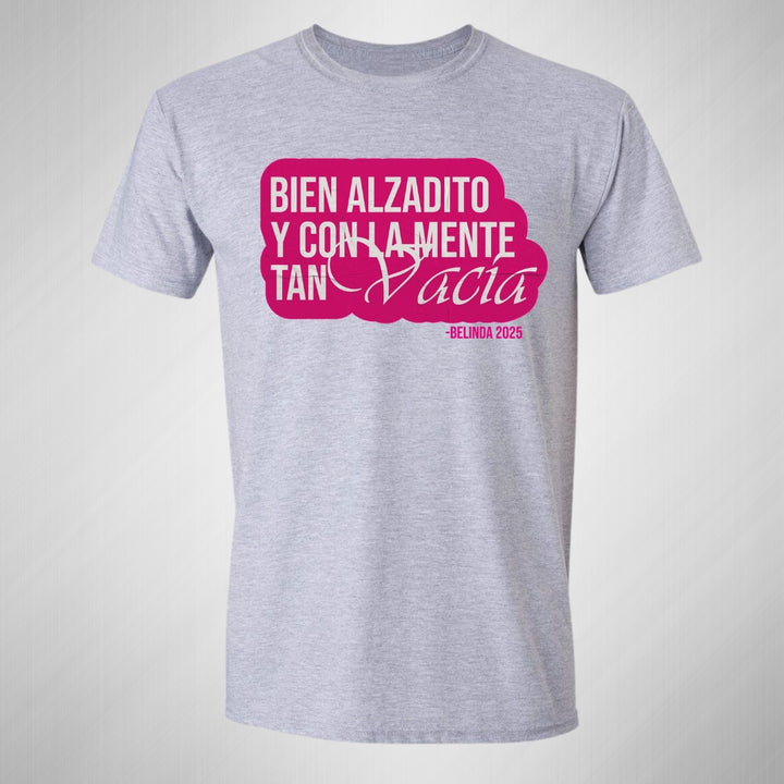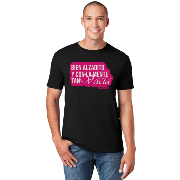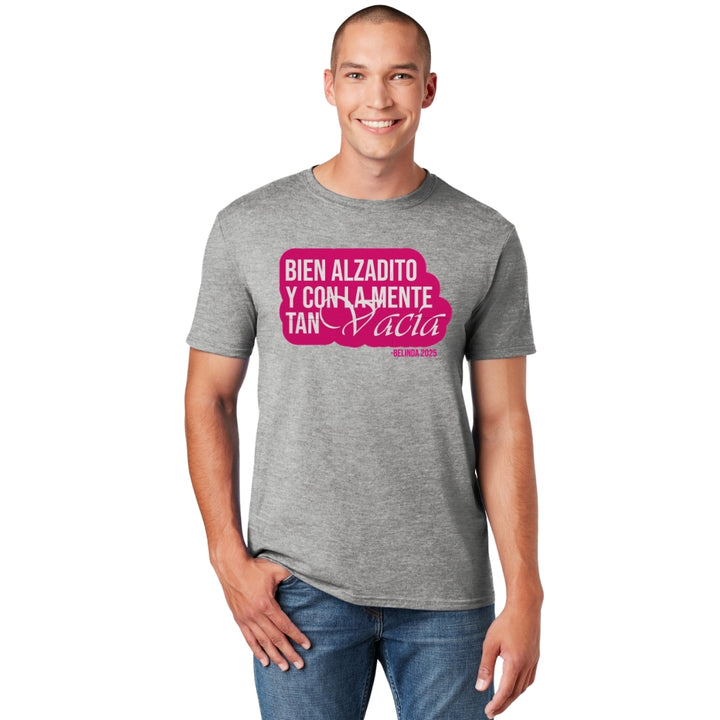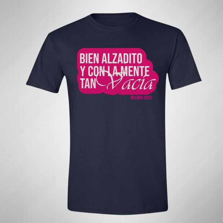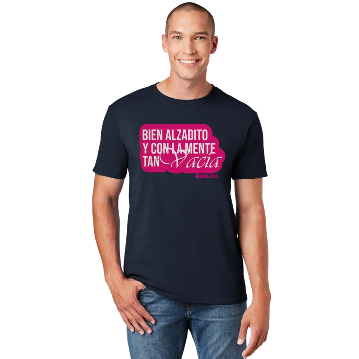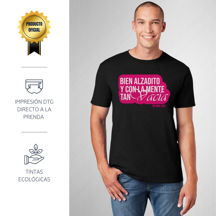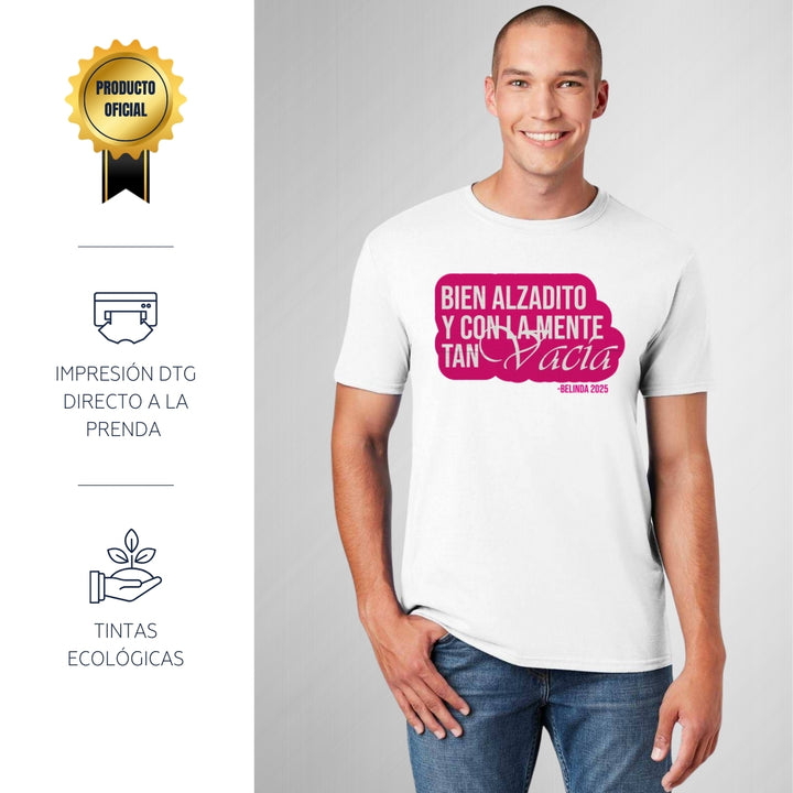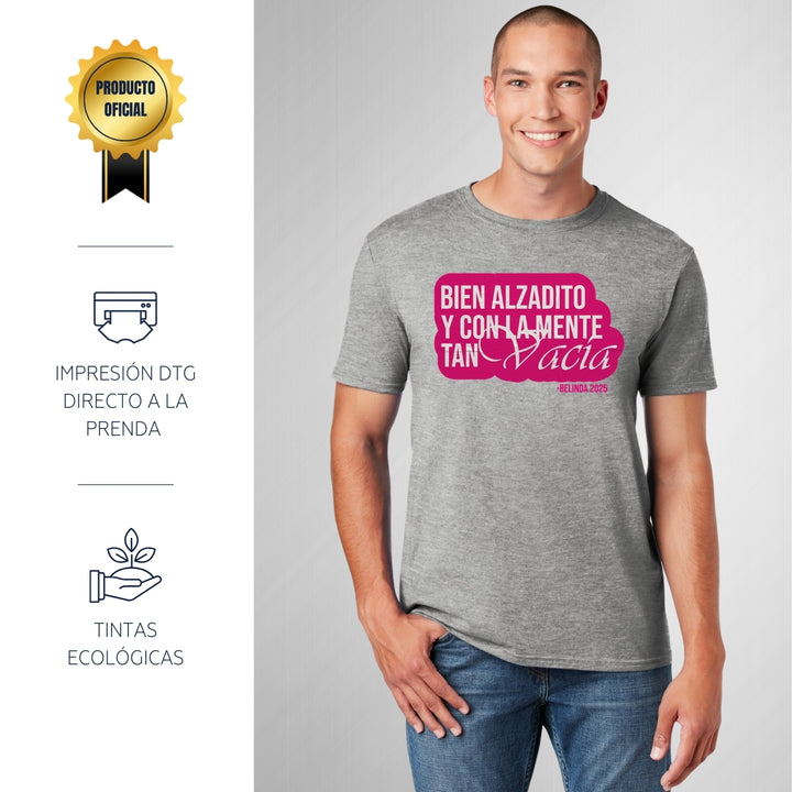 Playera de adulto manga corta, cuello redondo para hombre nueva, diseño Belinda Bien Alzadito original impreso con tecnología DTG (directo a la prenda) tacto cero, uso casual o deportiva, 100% algodón peinado, estructura tubular sin costuras laterales. Colores de camiseta para caballero: Negro, Blanco, Azul Marino, Gris.