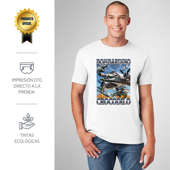 Playera de adulto manga corta, cuello redondo para hombre nueva, diseño Brainrot Bombardino Cocodrilo original impreso con tecnología DTG (directo a la prenda) tacto cero, uso casual o deportiva, 100% algodón peinado, estructura tubular sin costuras laterales. Colores de camiseta para caballero: Negro, Blanco, Azul Marino, Gris.