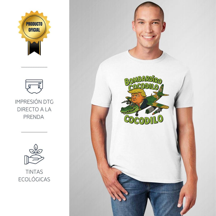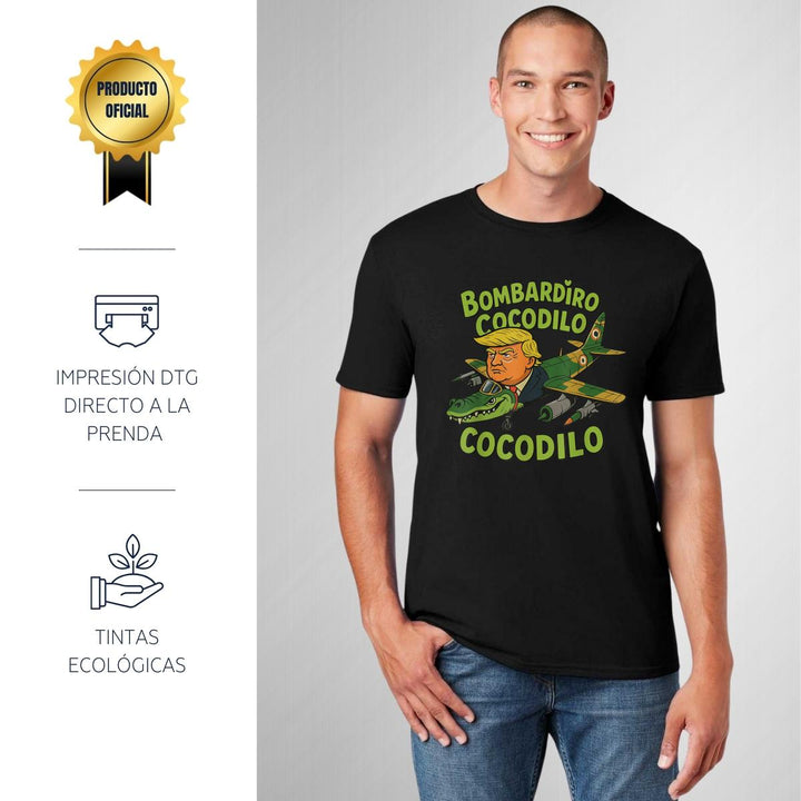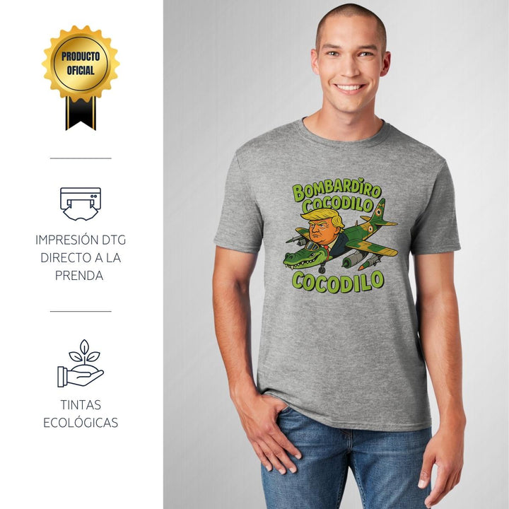 Playera de adulto manga corta, cuello redondo para hombre nueva, diseño Brainrot Bombardiro Crocodilo original impreso con tecnología DTG (directo a la prenda) tacto cero, uso casual o deportiva, 100% algodón peinado, estructura tubular sin costuras laterales. Colores de camiseta para caballero: Negro, Blanco, Azul Marino, Gris.