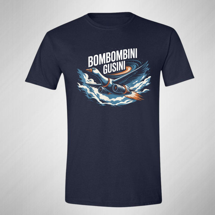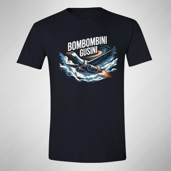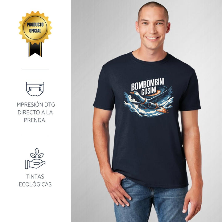 Playera de adulto manga corta, cuello redondo para hombre nueva, diseño Brainrot Bombombini Gusini original impreso con tecnología DTG (directo a la prenda) tacto cero, uso casual o deportiva, 100% algodón peinado, estructura tubular sin costuras laterales. Colores de camiseta para caballero: Negro, Blanco, Azul Marino, Gris.