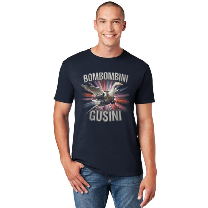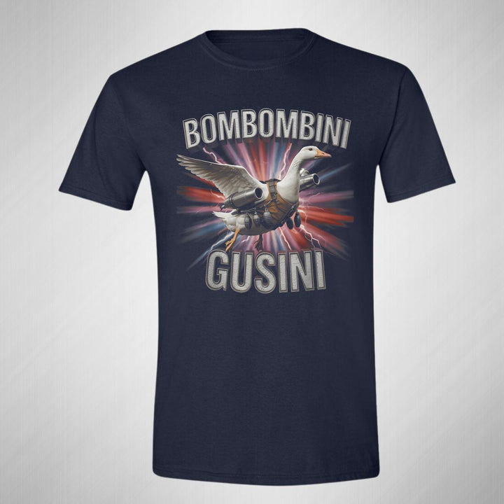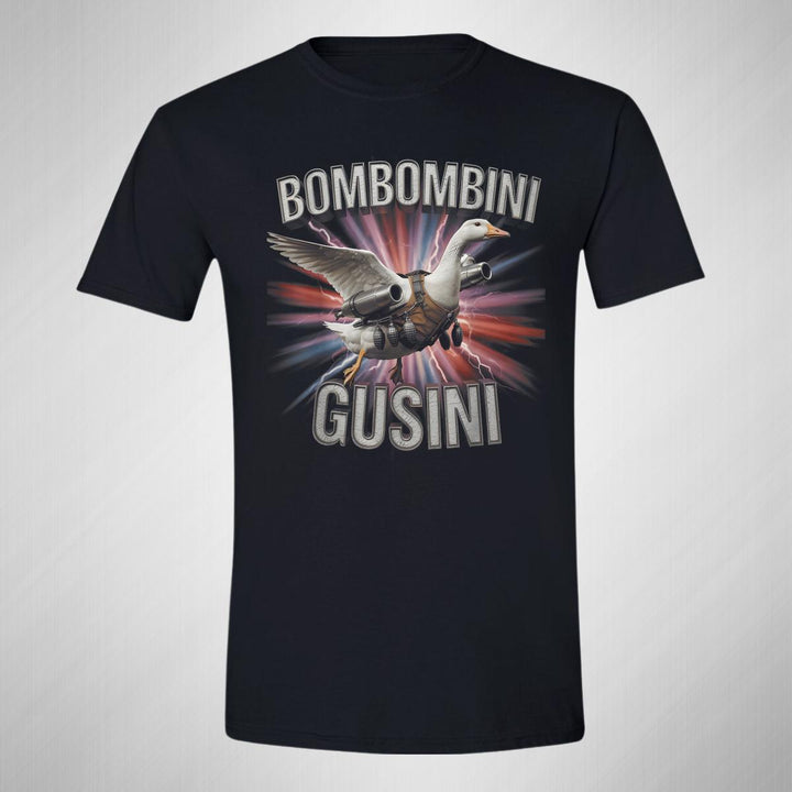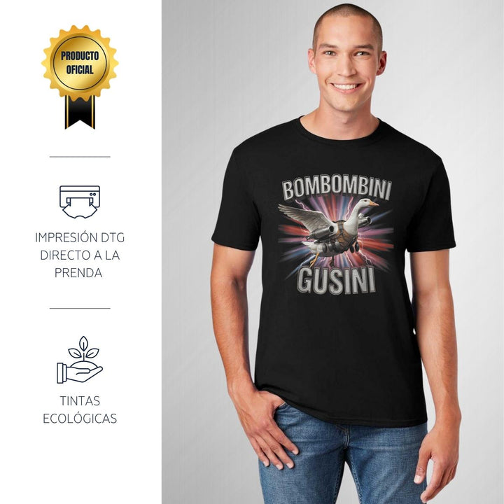 Playera de adulto manga corta, cuello redondo para hombre nueva, diseño Brainrot Bombombini Gusini original impreso con tecnología DTG (directo a la prenda) tacto cero, uso casual o deportiva, 100% algodón peinado, estructura tubular sin costuras laterales. Colores de camiseta para caballero: Negro, Blanco, Azul Marino, Gris.