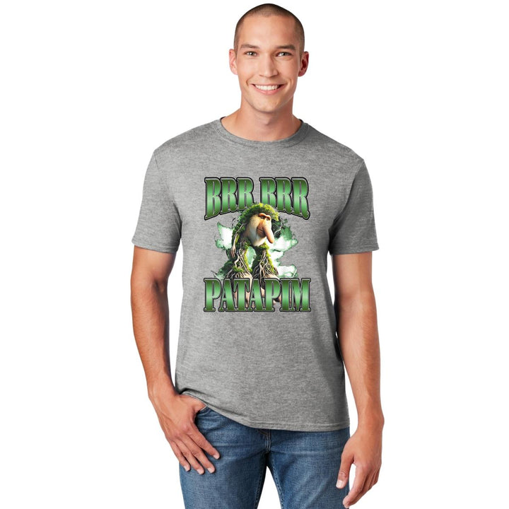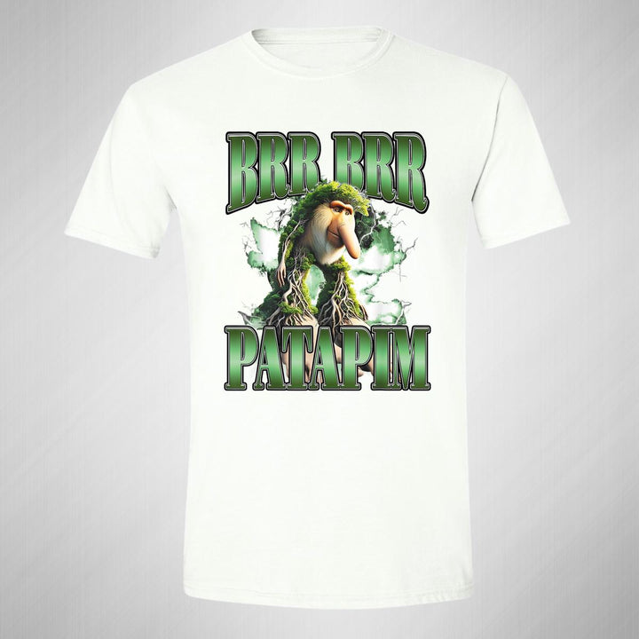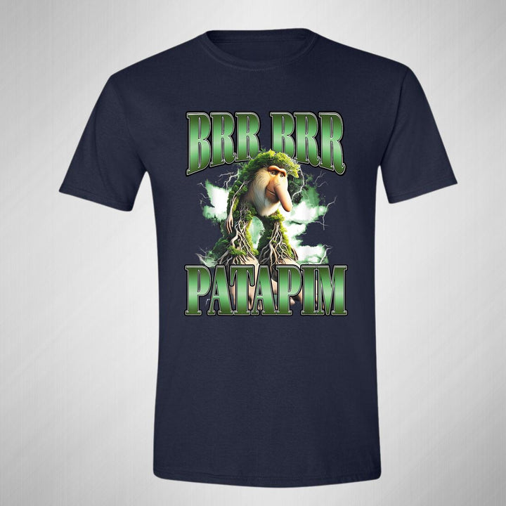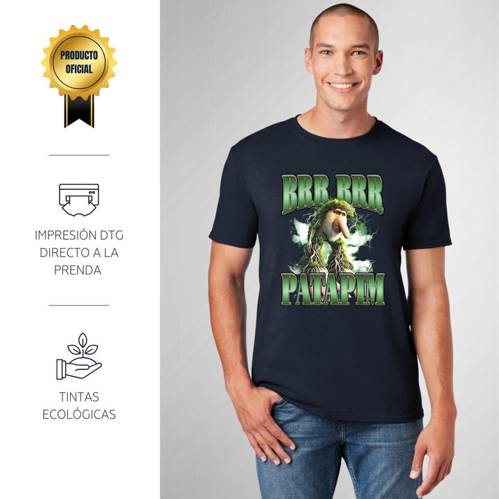 Playera de adulto manga corta, cuello redondo para hombre nueva, diseño Brainrot Brr Brr Patapim original impreso con tecnología DTG (directo a la prenda) tacto cero, uso casual o deportiva, 100% algodón peinado, estructura tubular sin costuras laterales. Colores de camiseta para caballero: Negro, Blanco, Azul Marino, Gris.