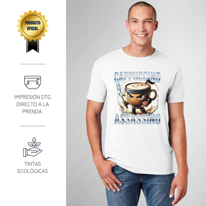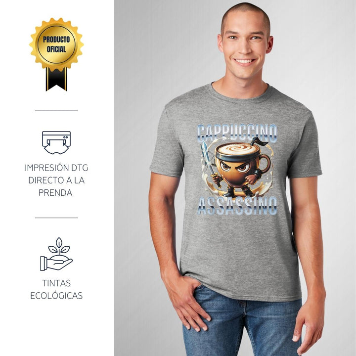 Playera de adulto manga corta, cuello redondo para hombre nueva, diseño Brainrot Cappuccino Assassino original impreso con tecnología DTG (directo a la prenda) tacto cero, uso casual o deportiva, 100% algodón peinado, estructura tubular sin costuras laterales. Colores de camiseta para caballero: Negro, Blanco, Azul Marino, Gris.