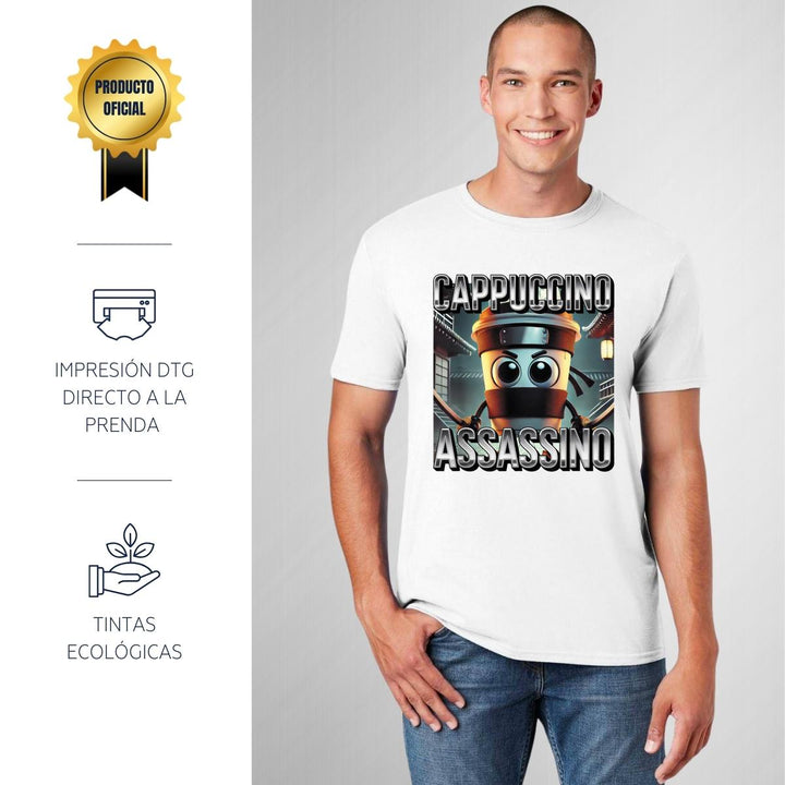 Playera de adulto manga corta, cuello redondo para hombre nueva, diseño Brainrot Cappuccino Assassino original impreso con tecnología DTG (directo a la prenda) tacto cero, uso casual o deportiva, 100% algodón peinado, estructura tubular sin costuras laterales. Colores de camiseta para caballero: Negro, Blanco, Azul Marino, Gris.
