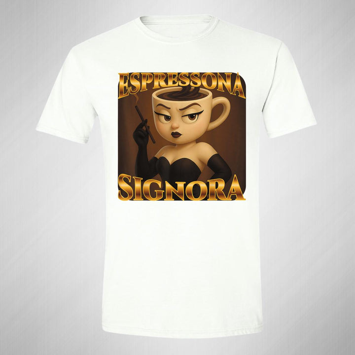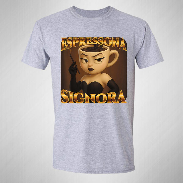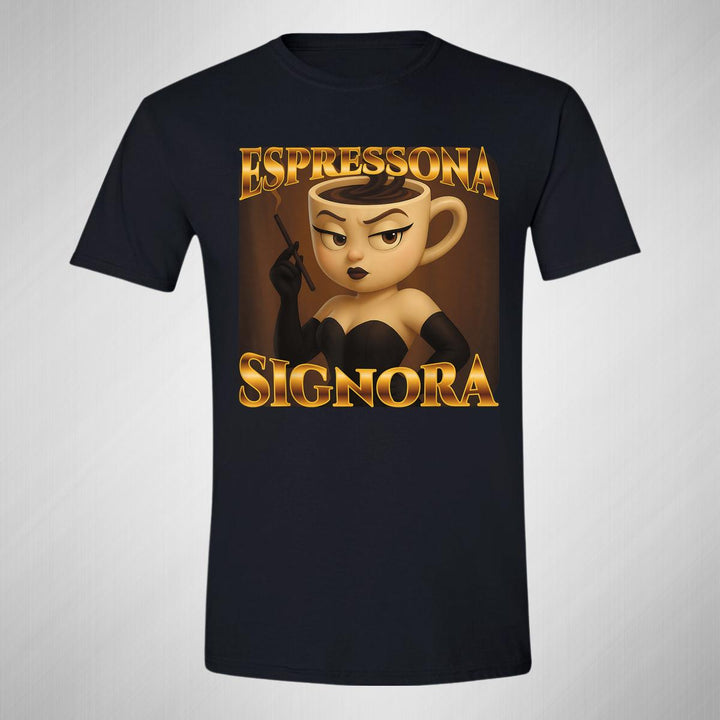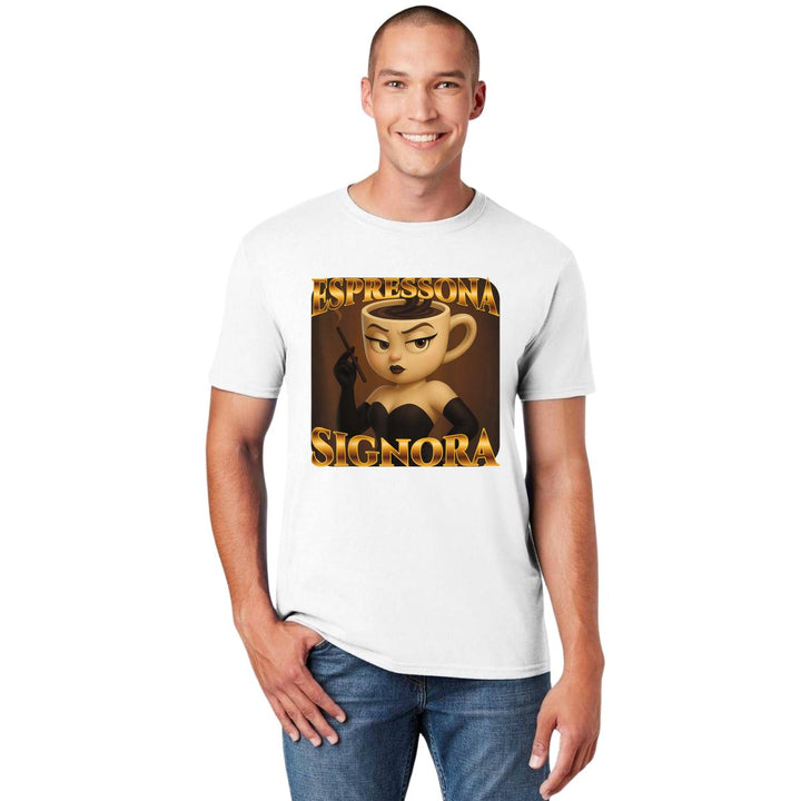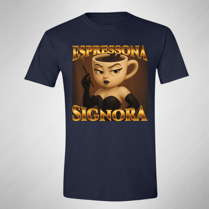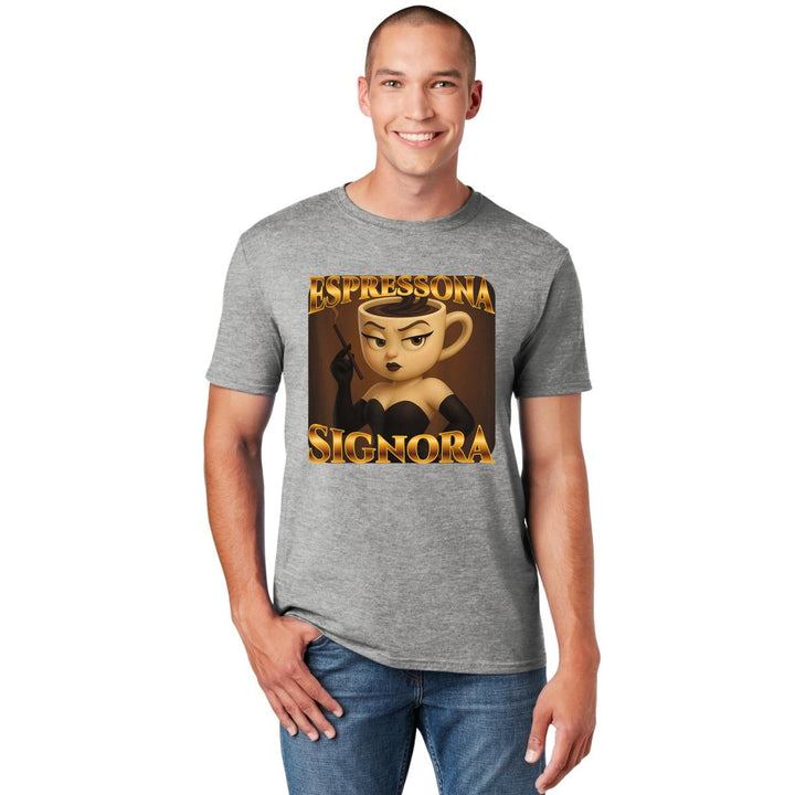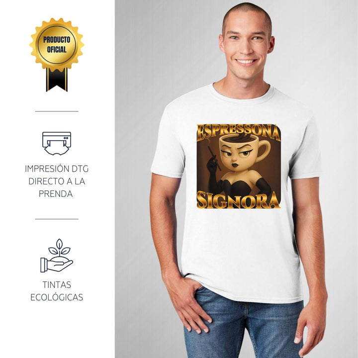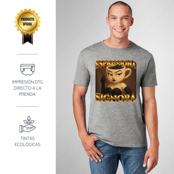 Playera de adulto manga corta, cuello redondo para hombre nueva, diseño Brainrot Espressona Signora original impreso con tecnología DTG (directo a la prenda) tacto cero, uso casual o deportiva, 100% algodón peinado, estructura tubular sin costuras laterales. Colores de camiseta para caballero: Negro, Blanco, Azul Marino, Gris.