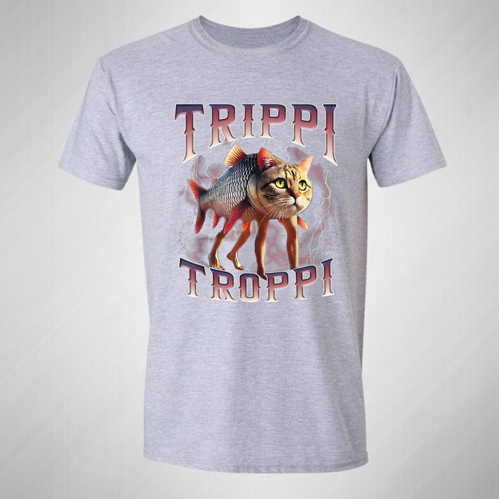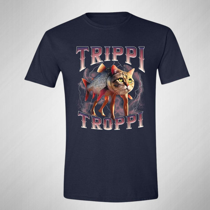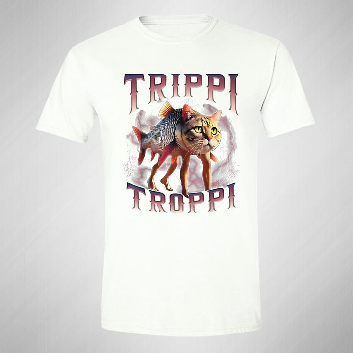Playera de adulto manga corta, cuello redondo para hombre nueva, diseño Brainrot Trippi Troppi original impreso con tecnología DTG (directo a la prenda) tacto cero, uso casual o deportiva, 100% algodón peinado, estructura tubular sin costuras laterales. Colores de camiseta para caballero: Negro, Blanco, Azul Marino, Gris.