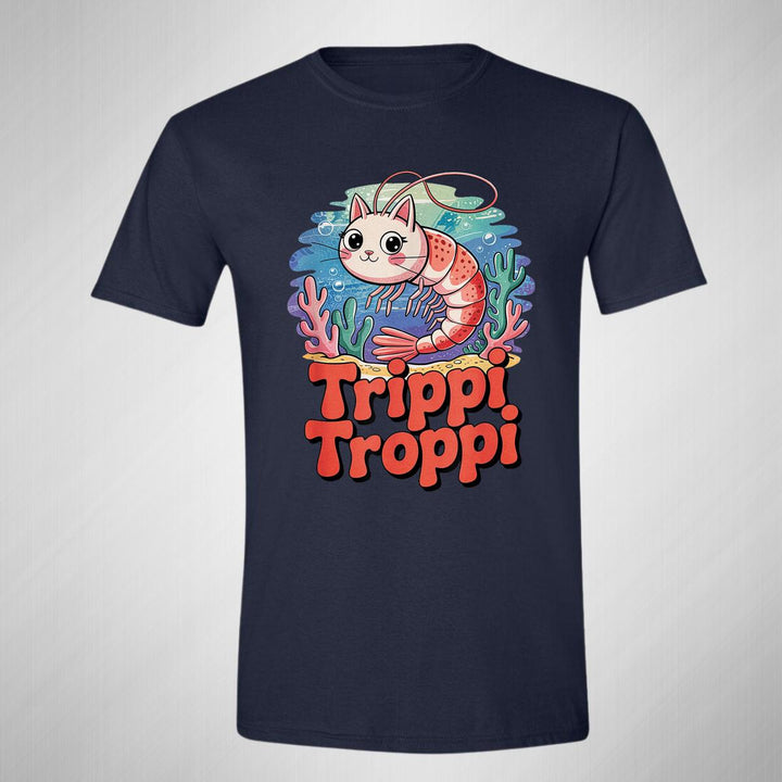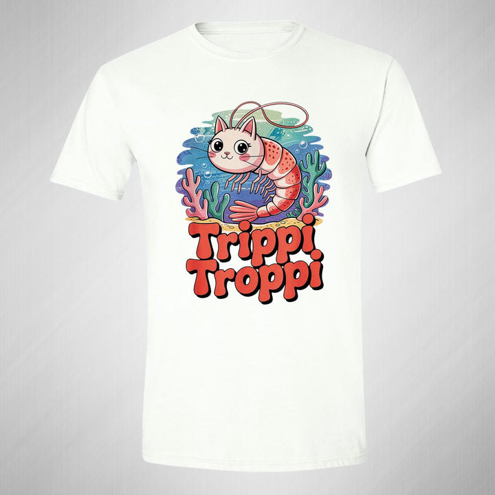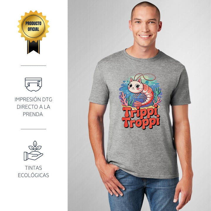 Playera de adulto manga corta, cuello redondo para hombre nueva, diseño Brainrot Trippi Troppi original impreso con tecnología DTG (directo a la prenda) tacto cero, uso casual o deportiva, 100% algodón peinado, estructura tubular sin costuras laterales. Colores de camiseta para caballero: Negro, Blanco, Azul Marino, Gris.