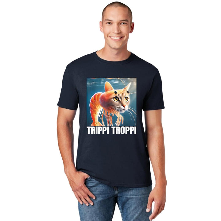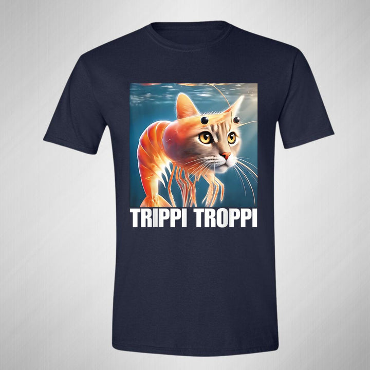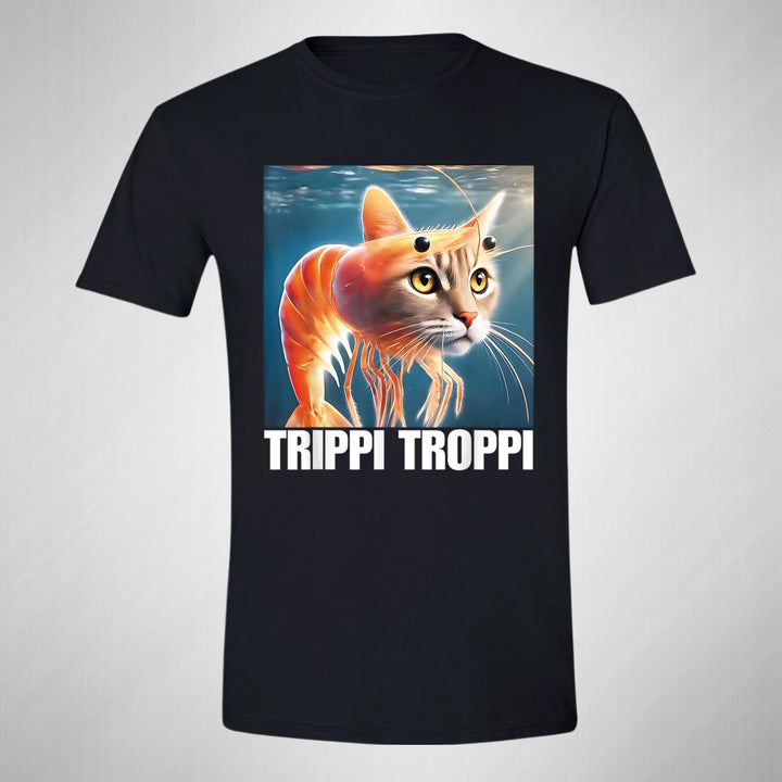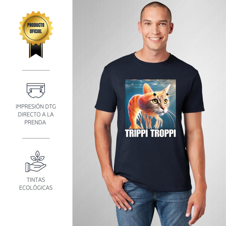 Playera de adulto manga corta, cuello redondo para hombre nueva, diseño Brainrot Trippi Troppi original impreso con tecnología DTG (directo a la prenda) tacto cero, uso casual o deportiva, 100% algodón peinado, estructura tubular sin costuras laterales. Colores de camiseta para caballero: Negro, Blanco, Azul Marino, Gris.