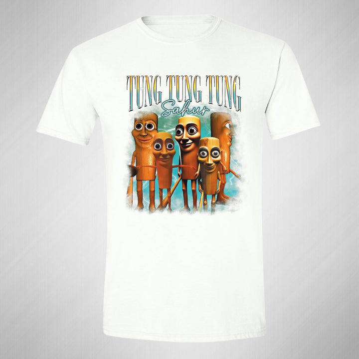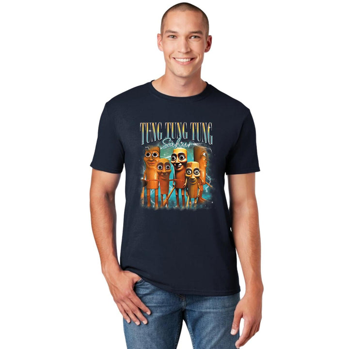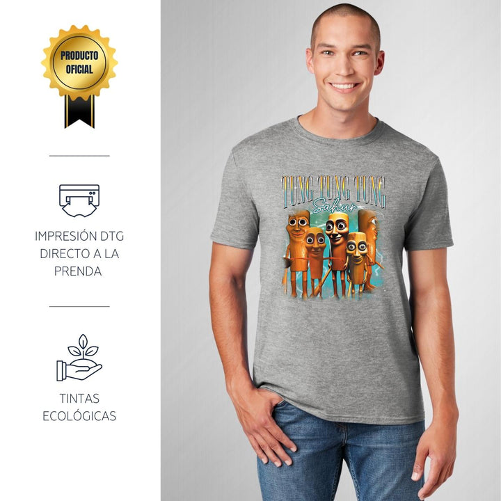 Playera de adulto manga corta, cuello redondo para hombre nueva, diseño Brainrot Tung Tung Tung Sahur original impreso con tecnología DTG (directo a la prenda) tacto cero, uso casual o deportiva, 100% algodón peinado, estructura tubular sin costuras laterales. Colores de camiseta para caballero: Negro, Blanco, Azul Marino, Gris.