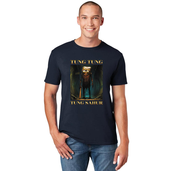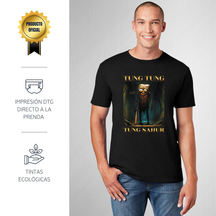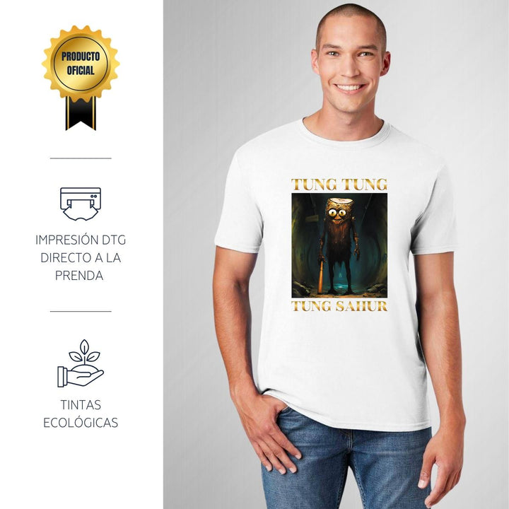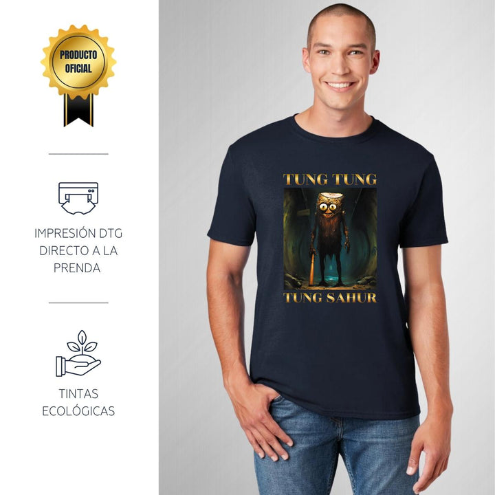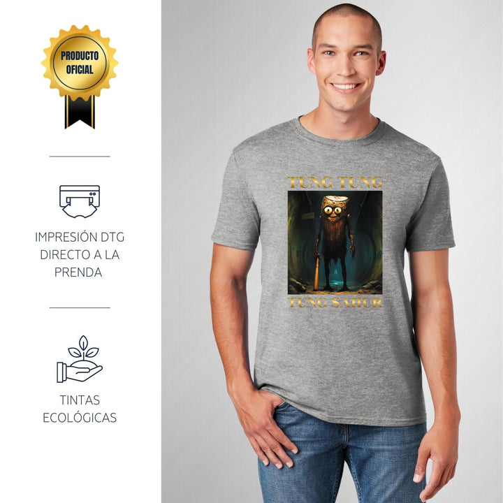 Playera de adulto manga corta, cuello redondo para hombre nueva, diseño Brainrot Tung Tung Tung Sahur original impreso con tecnología DTG (directo a la prenda) tacto cero, uso casual o deportiva, 100% algodón peinado, estructura tubular sin costuras laterales. Colores de camiseta para caballero: Negro, Blanco, Azul Marino, Gris.