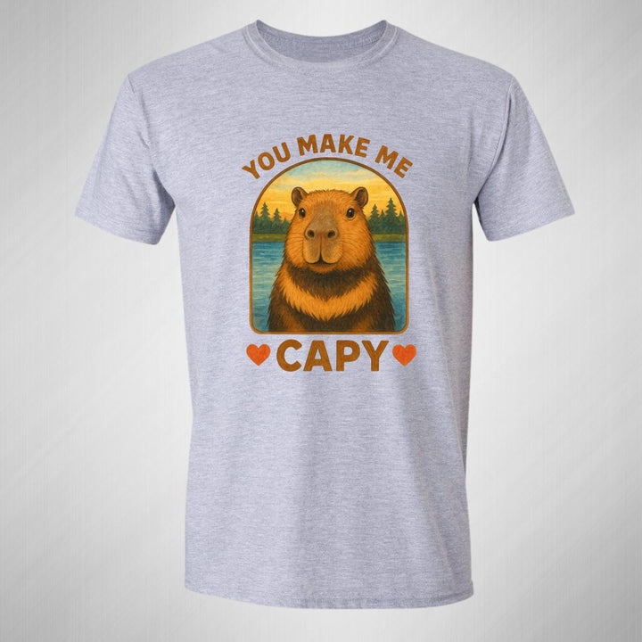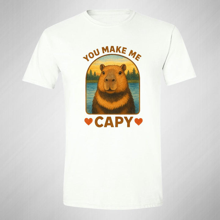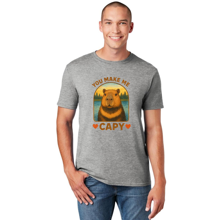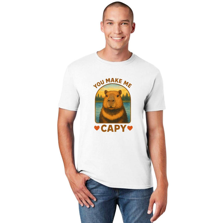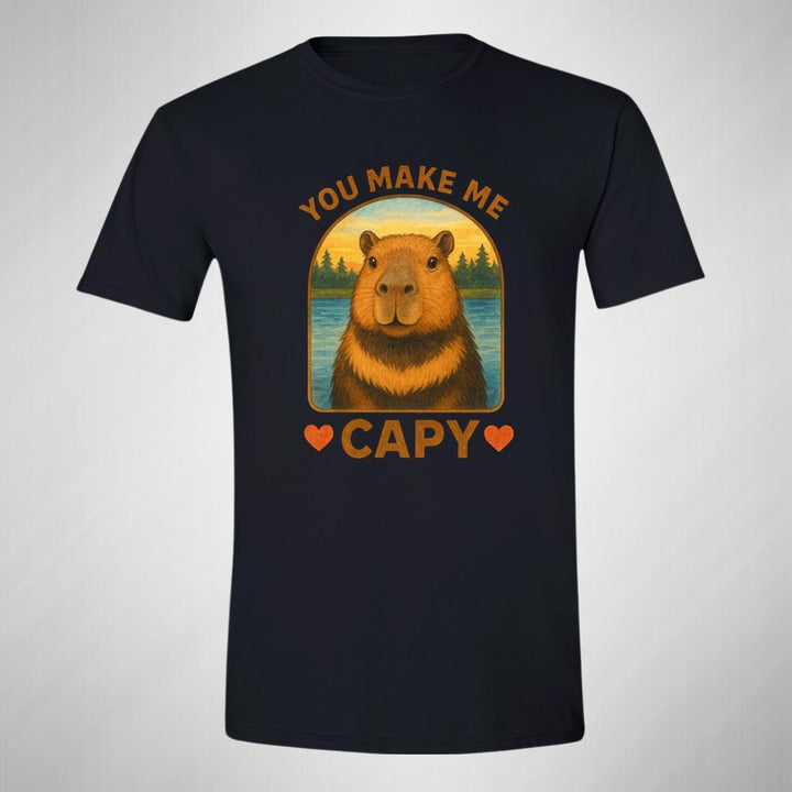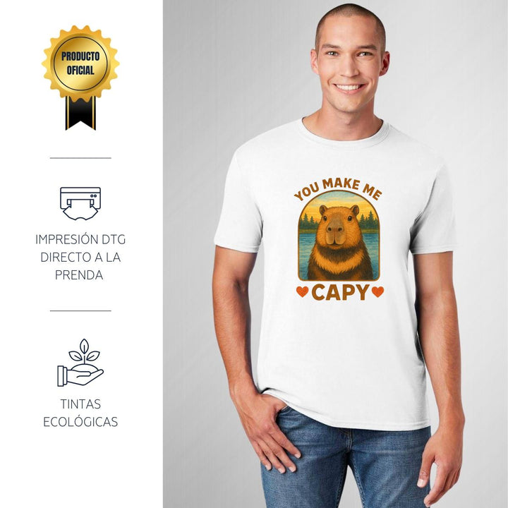 Playera de adulto manga corta, cuello redondo para hombre nueva, diseño Capibara Carpincho Frases original impreso con tecnología DTG (directo a la prenda) tacto cero, uso casual o deportiva, 100% algodón peinado, estructura tubular sin costuras laterales. Colores de camiseta para caballero: Negro, Blanco, Azul Marino, Gris.