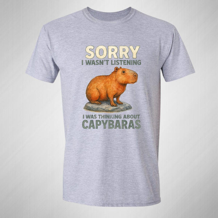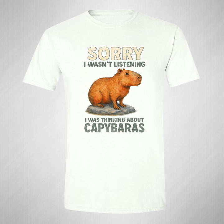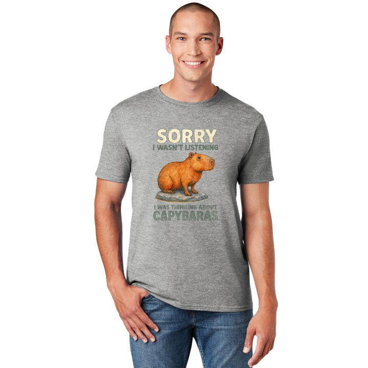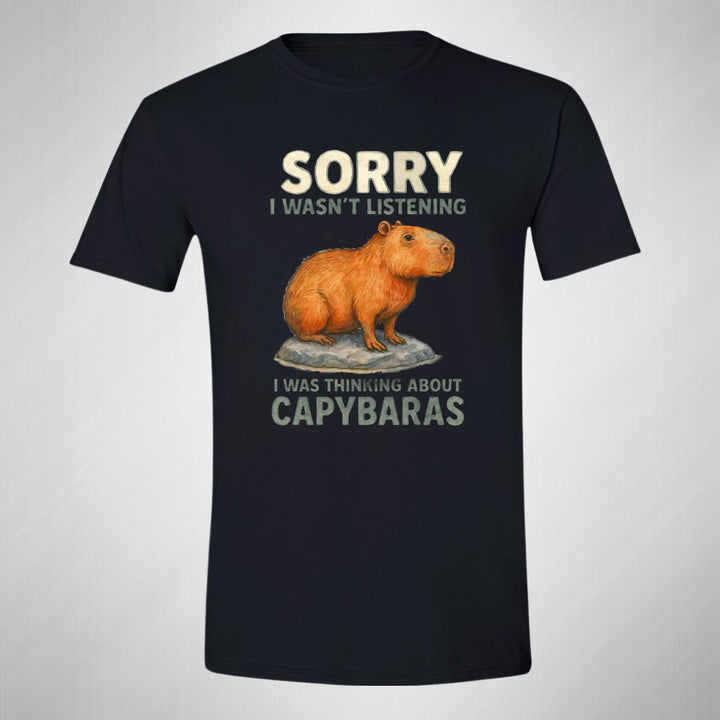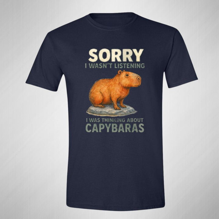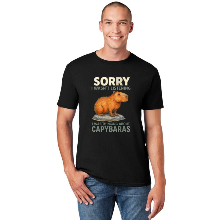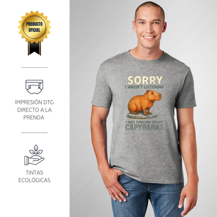 Playera de adulto manga corta, cuello redondo para hombre nueva, diseño Capibara Carpincho Frases original impreso con tecnología DTG (directo a la prenda) tacto cero, uso casual o deportiva, 100% algodón peinado, estructura tubular sin costuras laterales. Colores de camiseta para caballero: Negro, Blanco, Azul Marino, Gris.
