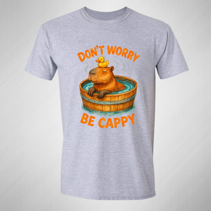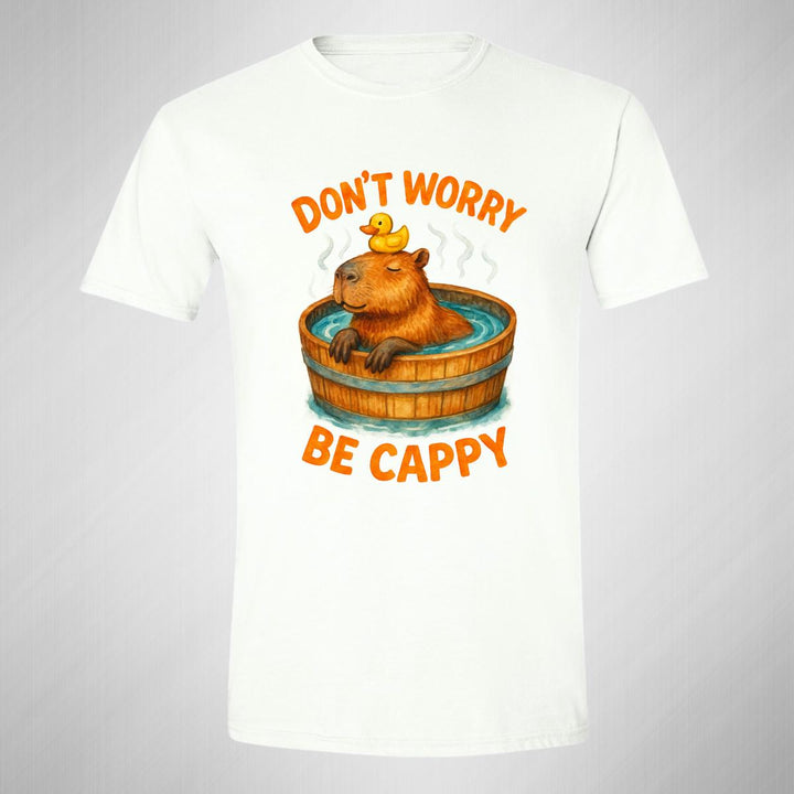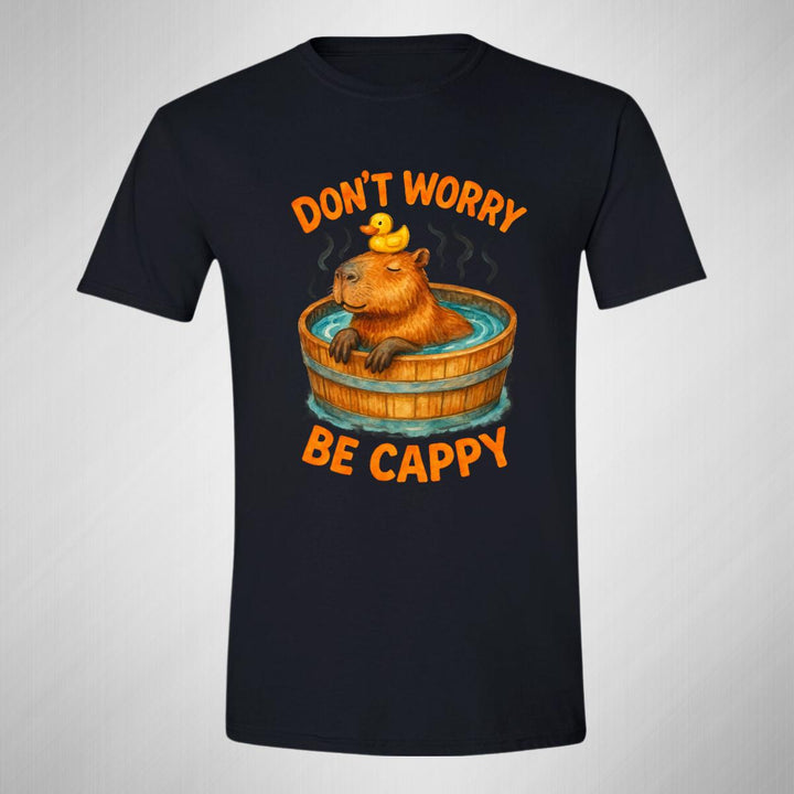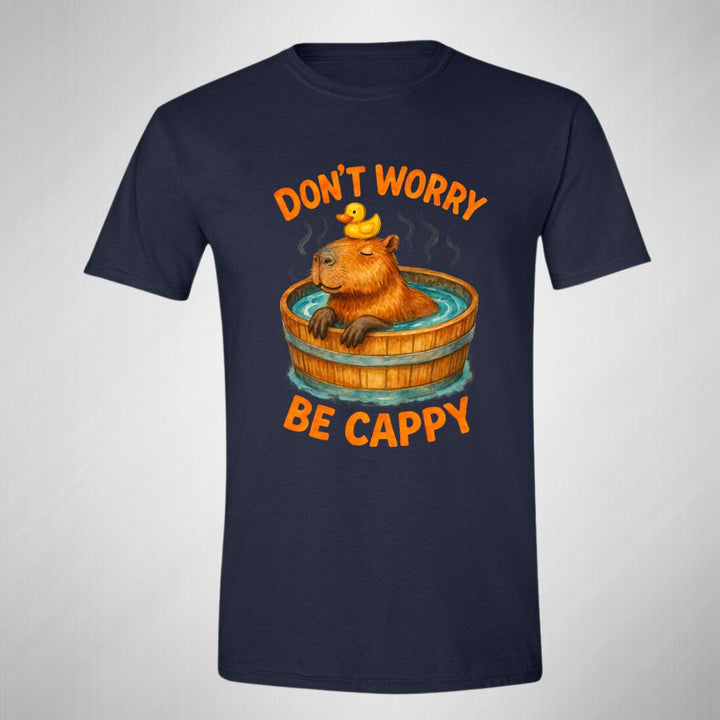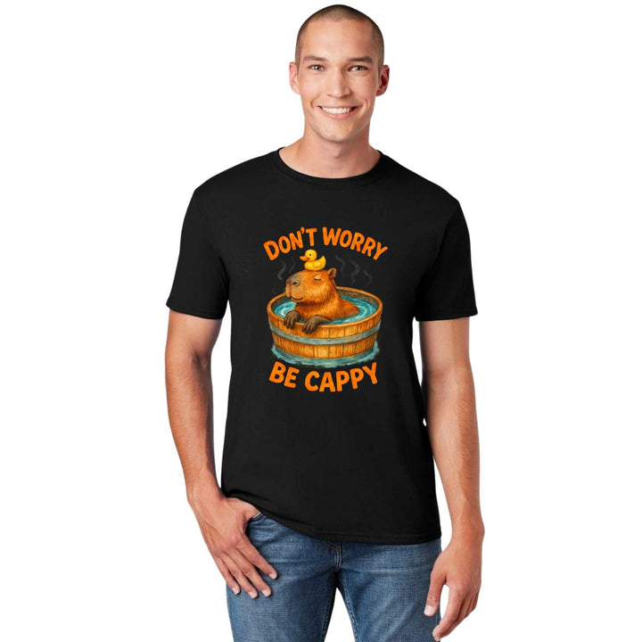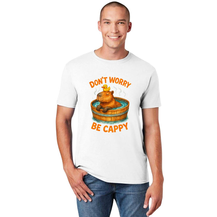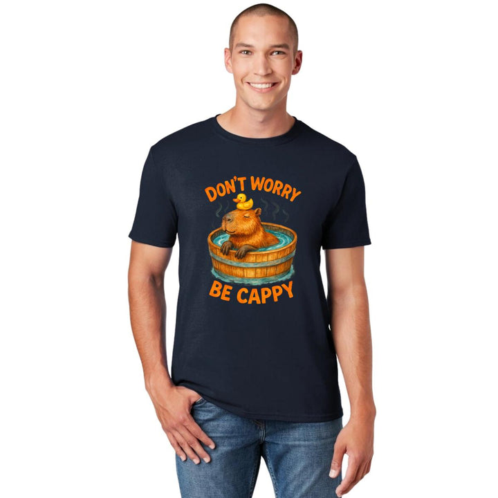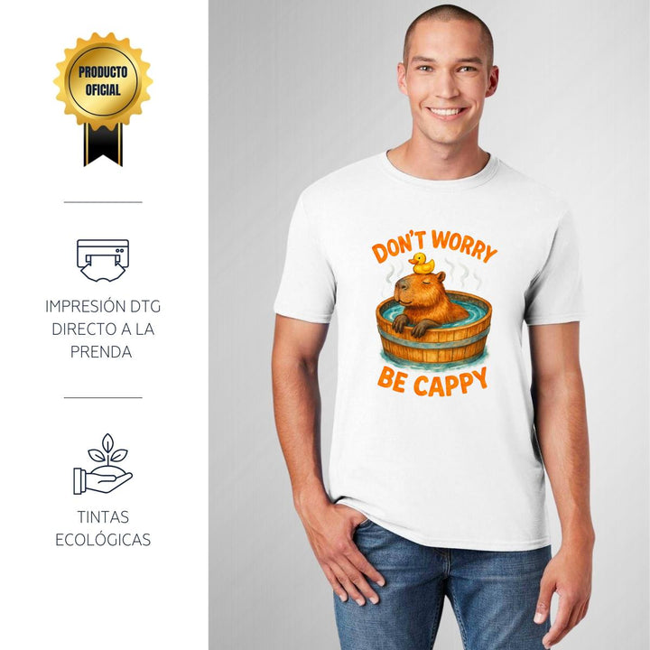 Playera de adulto manga corta, cuello redondo para hombre nueva, diseño Capibara Carpincho Frases original impreso con tecnología DTG (directo a la prenda) tacto cero, uso casual o deportiva, 100% algodón peinado, estructura tubular sin costuras laterales. Colores de camiseta para caballero: Negro, Blanco, Azul Marino, Gris.