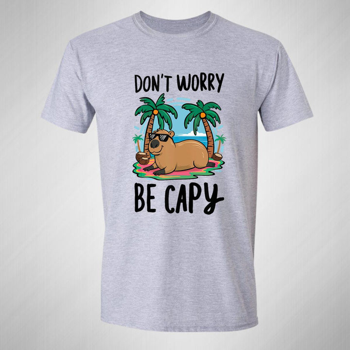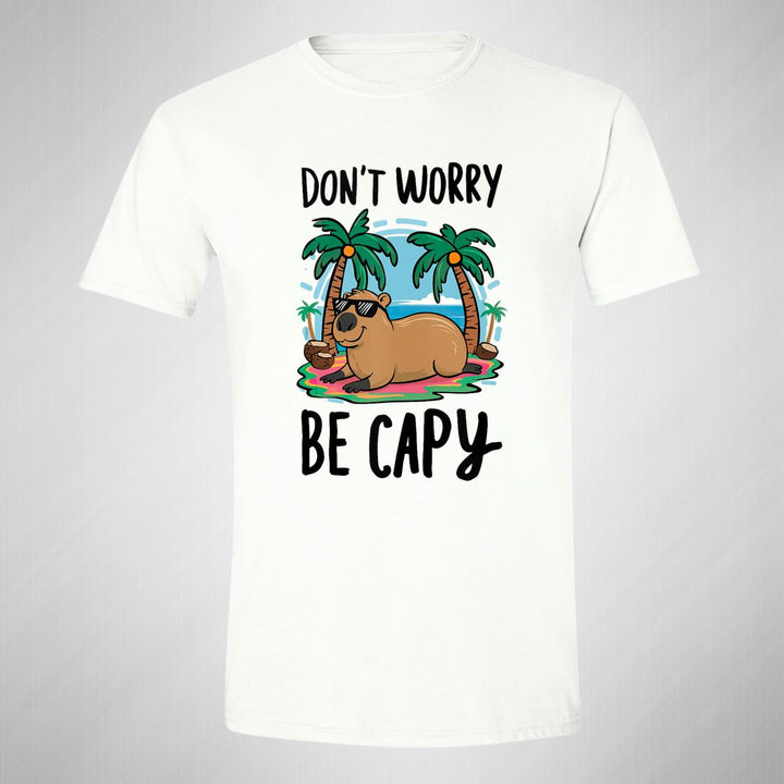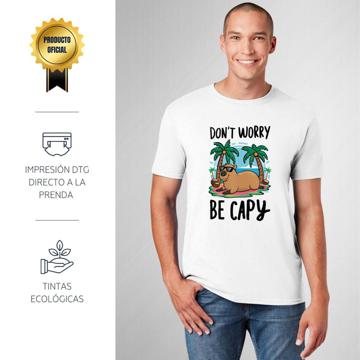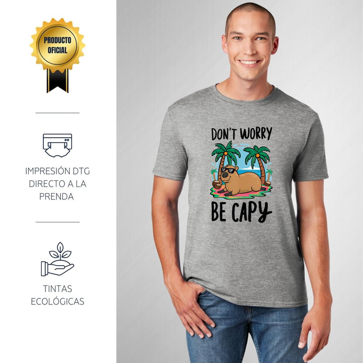 Playera de adulto manga corta, cuello redondo para hombre nueva, diseño Capibara Carpincho Frases original impreso con tecnología DTG (directo a la prenda) tacto cero, uso casual o deportiva, 100% algodón peinado, estructura tubular sin costuras laterales. Colores de camiseta para caballero: Blanco, Gris.