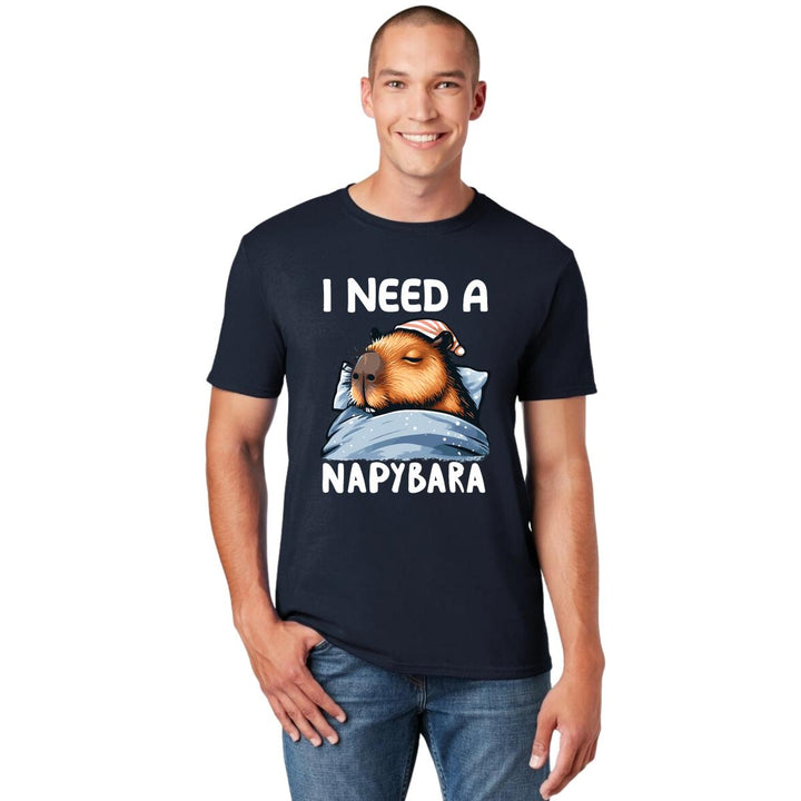 Playera de adulto manga corta, cuello redondo para hombre nueva, diseño Capibara Carpincho Frases original impreso con tecnología DTG (directo a la prenda) tacto cero, uso casual o deportiva, 100% algodón peinado, estructura tubular sin costuras laterales. Colores de camiseta para caballero: Negro, Azul Marino.