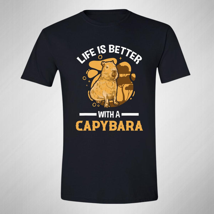 Playera de adulto manga corta, cuello redondo para hombre nueva, diseño Capibara Carpincho Frases original impreso con tecnología DTG (directo a la prenda) tacto cero, uso casual o deportiva, 100% algodón peinado, estructura tubular sin costuras laterales. Colores de camiseta para caballero: Negro, Azul Marino.