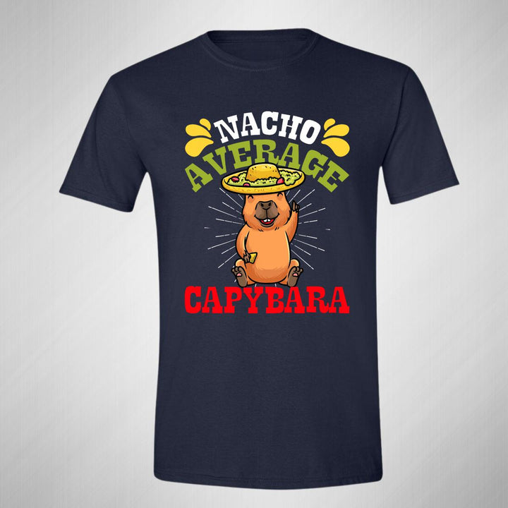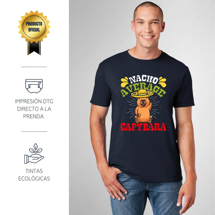 Playera de adulto manga corta, cuello redondo para hombre nueva, diseño Capibara Carpincho Frases original impreso con tecnología DTG (directo a la prenda) tacto cero, uso casual o deportiva, 100% algodón peinado, estructura tubular sin costuras laterales. Colores de camiseta para caballero: Negro, Azul Marino.