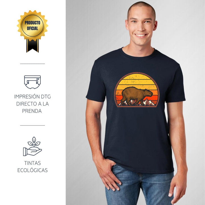 Playera de adulto manga corta, cuello redondo para hombre nueva, diseño Capibara Carpincho Frases original impreso con tecnología DTG (directo a la prenda) tacto cero, uso casual o deportiva, 100% algodón peinado, estructura tubular sin costuras laterales. Colores de camiseta para caballero: Negro, Azul Marino.
