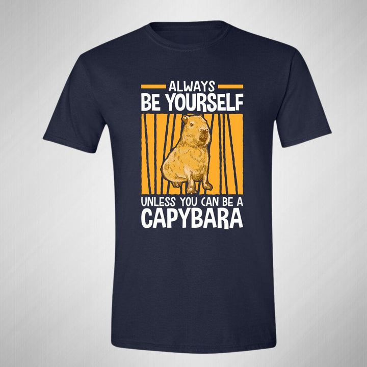 Playera de adulto manga corta, cuello redondo para hombre nueva, diseño Capibara Carpincho Frases original impreso con tecnología DTG (directo a la prenda) tacto cero, uso casual o deportiva, 100% algodón peinado, estructura tubular sin costuras laterales. Colores de camiseta para caballero: Negro, Azul Marino.
