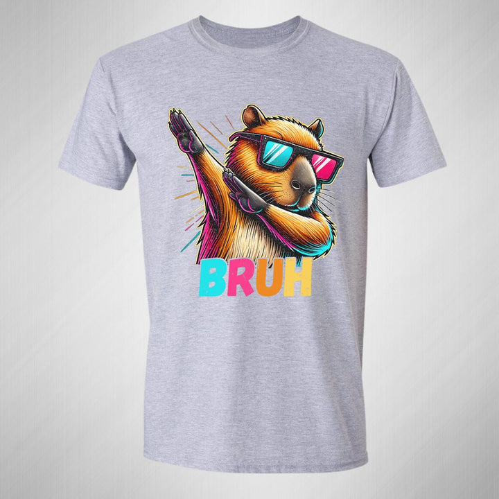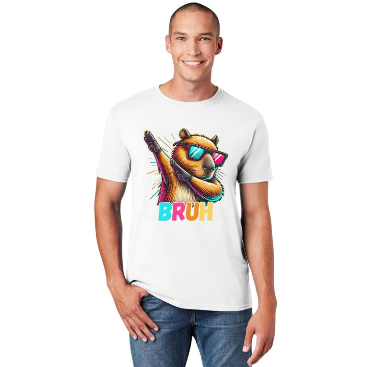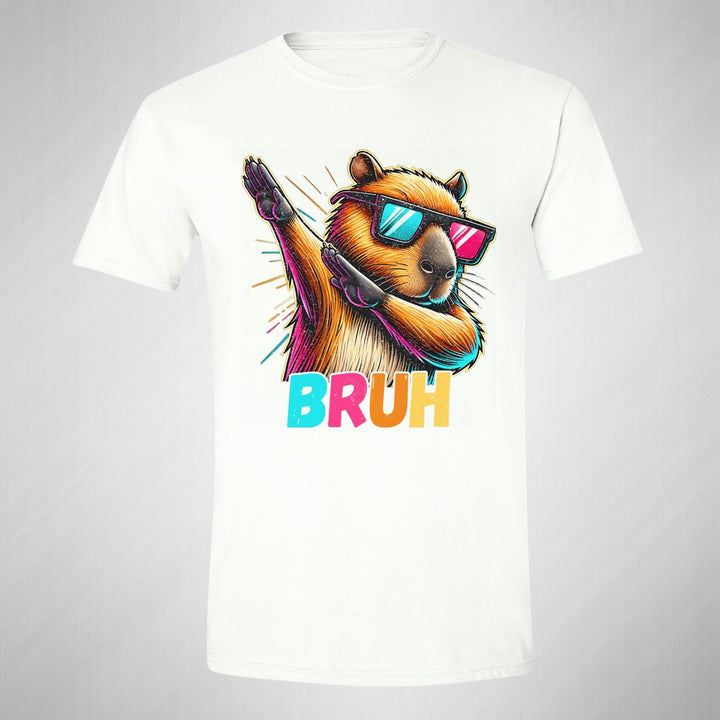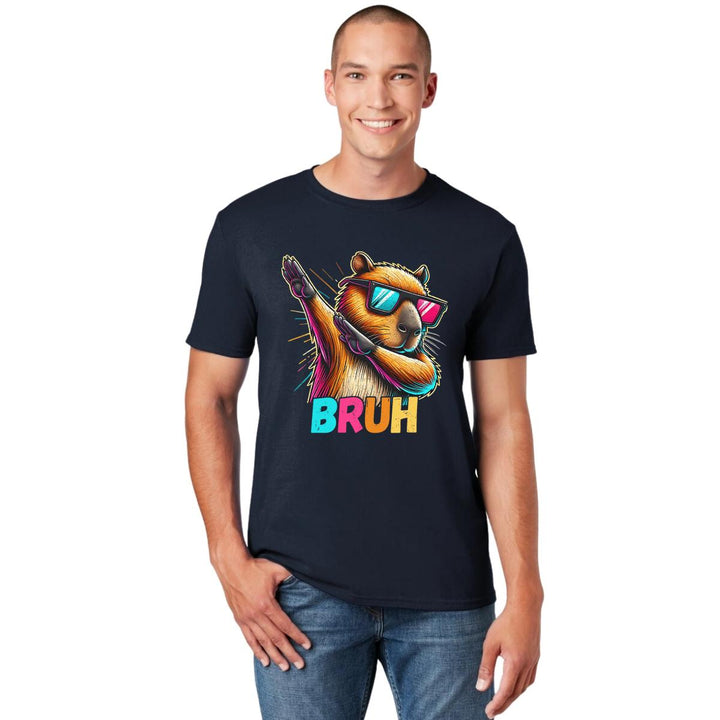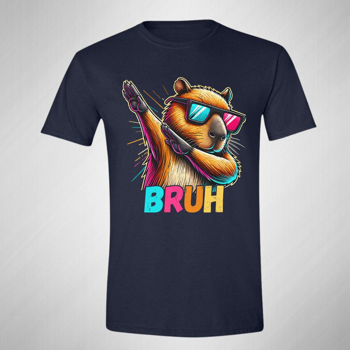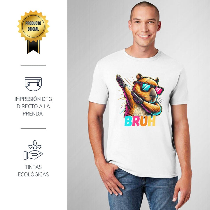 Playera de adulto manga corta, cuello redondo para hombre nueva, diseño Capibara Carpincho Frases original impreso con tecnología DTG (directo a la prenda) tacto cero, uso casual o deportiva, 100% algodón peinado, estructura tubular sin costuras laterales. Colores de camiseta para caballero: Negro, Blanco, Azul Marino, Gris.
