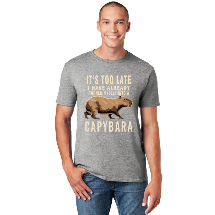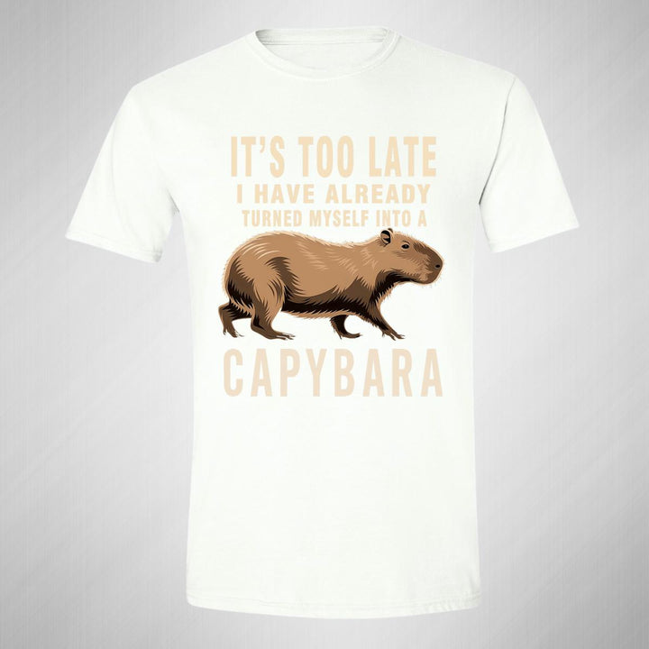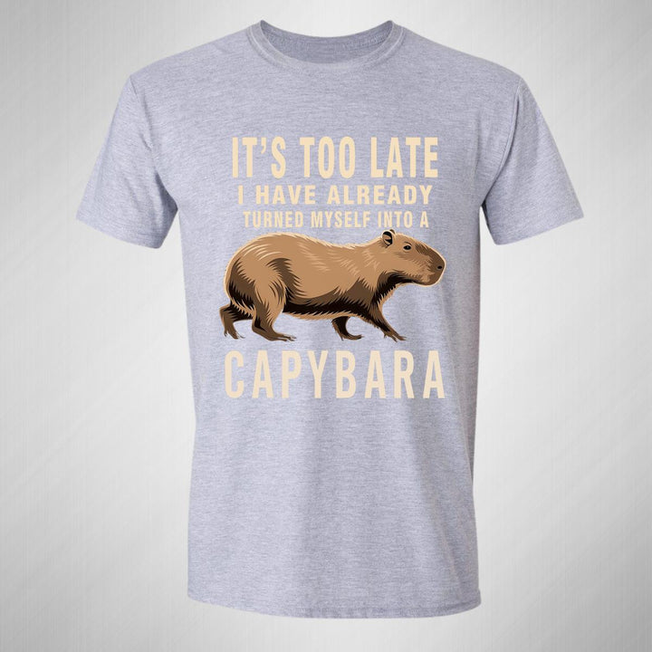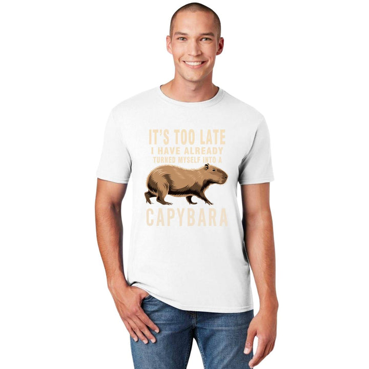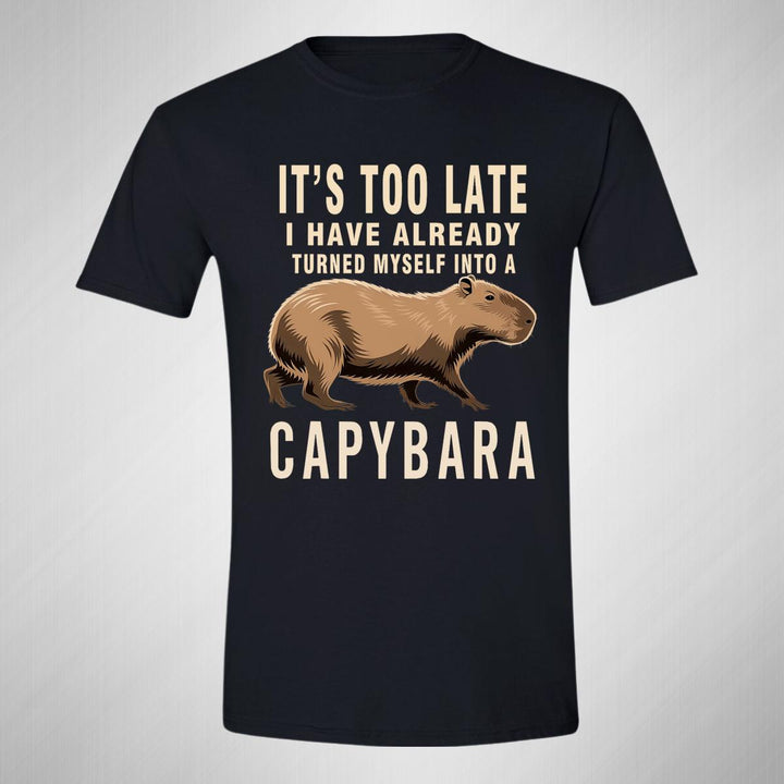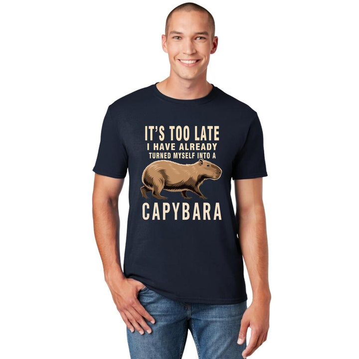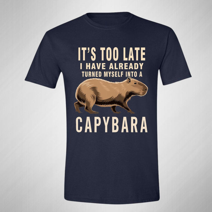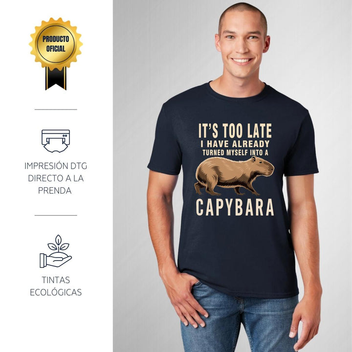Playera de adulto manga corta, cuello redondo para hombre nueva, diseño Capibara Carpincho Frases original impreso con tecnología DTG (directo a la prenda) tacto cero, uso casual o deportiva, 100% algodón peinado, estructura tubular sin costuras laterales. Colores de camiseta para caballero: Negro, Blanco, Azul Marino, Gris.