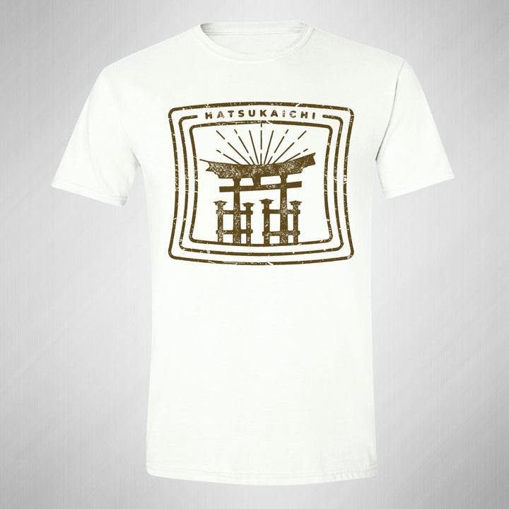 Playera de adulto manga corta, cuello redondo para hombre nueva, diseño Ciudad Hatsukaichi Japón original impreso con tecnología DTG (directo a la prenda) tacto cero, uso casual o deportiva, 100% algodón peinado, estructura tubular sin costuras laterales. Colores de camiseta para caballero: Blanco.