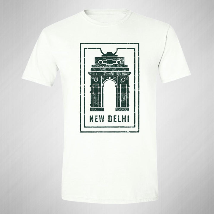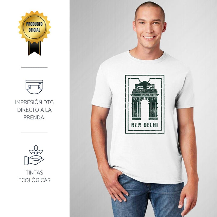 Playera de adulto manga corta, cuello redondo para hombre nueva, diseño Ciudad Nueva Delhi India original impreso con tecnología DTG (directo a la prenda) tacto cero, uso casual o deportiva, 100% algodón peinado, estructura tubular sin costuras laterales. Colores de camiseta para caballero: Blanco.