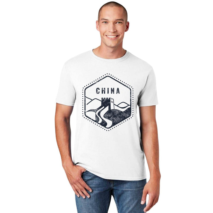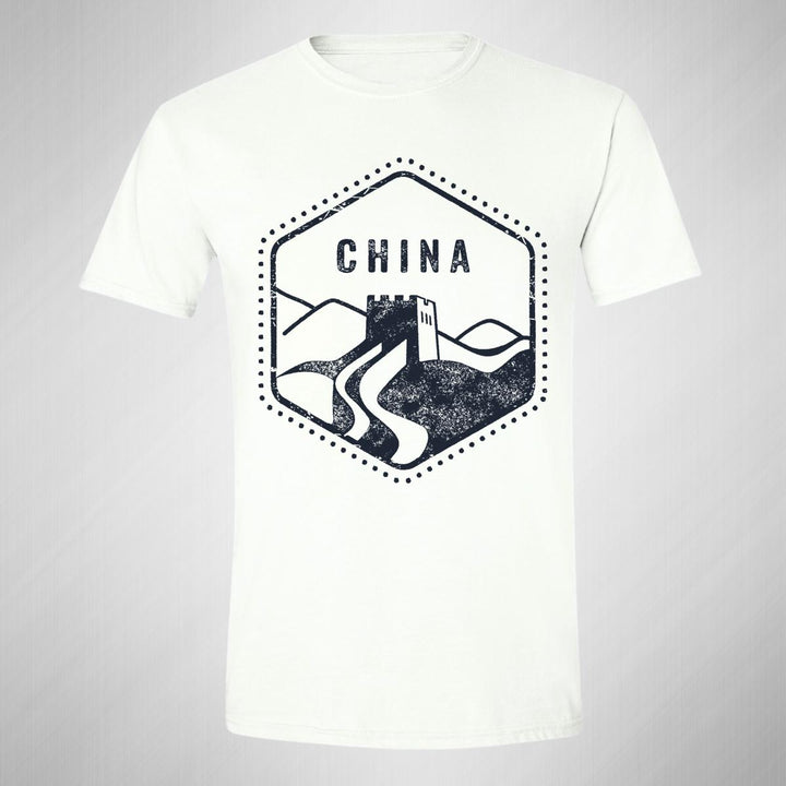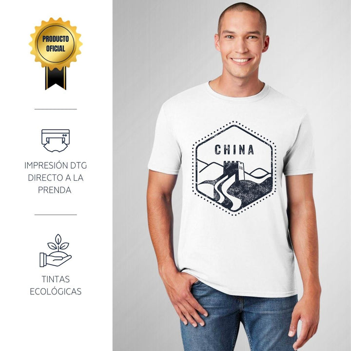 Playera de adulto manga corta, cuello redondo para hombre nueva, diseño País China original impreso con tecnología DTG (directo a la prenda) tacto cero, uso casual o deportiva, 100% algodón peinado, estructura tubular sin costuras laterales. Colores de camiseta para caballero: Blanco.