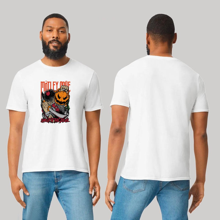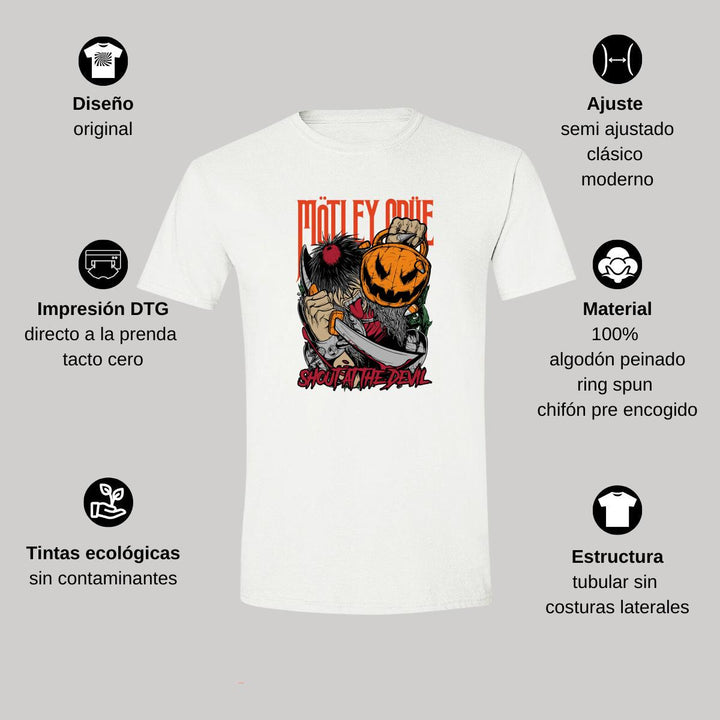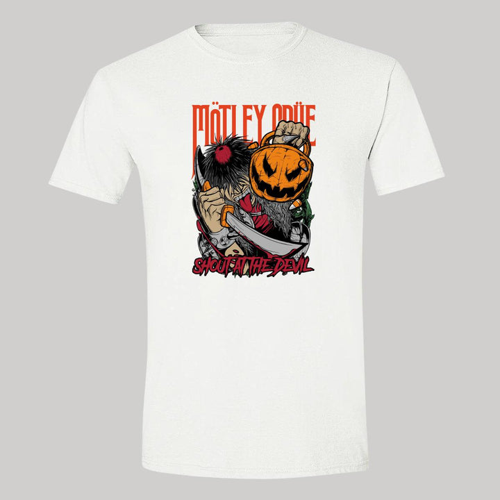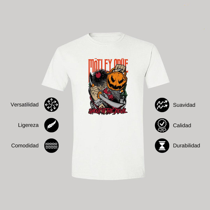 Playera de adulto manga corta, cuello redondo para hombre nueva, diseño Motley Crue Shout at the devil original impreso con tecnología DTG (directo a la prenda) tacto cero, uso casual o deportiva, 100% algodón peinado, estructura tubular sin costuras laterales. Colores de camiseta para caballero: Blanco.