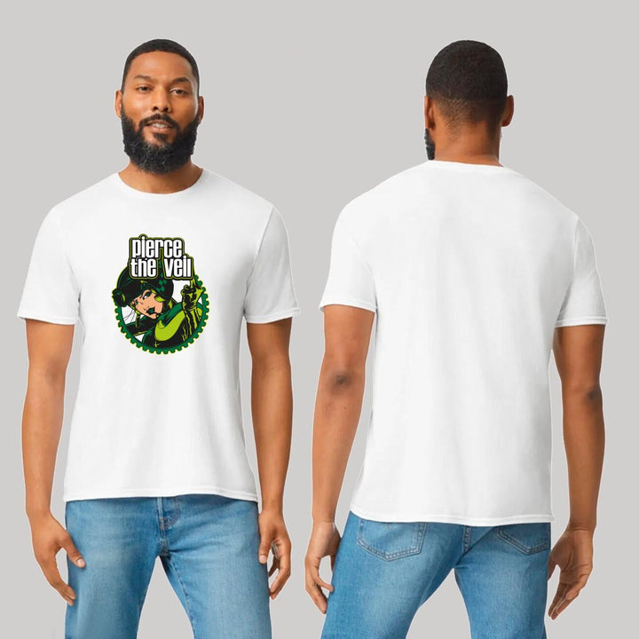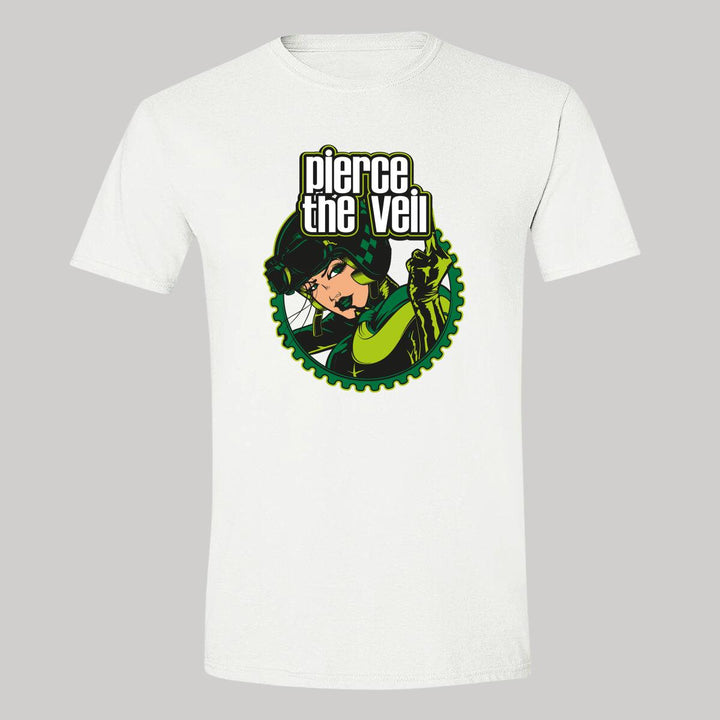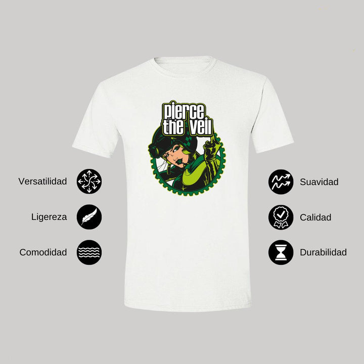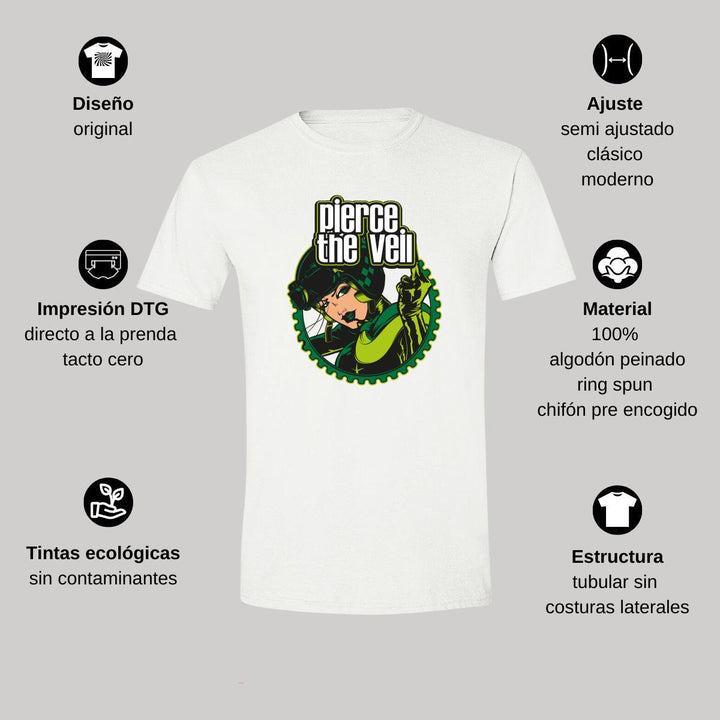 Playera de adulto manga corta, cuello redondo para hombre nueva, diseño Pierce The Veil Póster original impreso con tecnología DTG (directo a la prenda) tacto cero, uso casual o deportiva, 100% algodón peinado, estructura tubular sin costuras laterales. Colores de camiseta para caballero: Blanco.