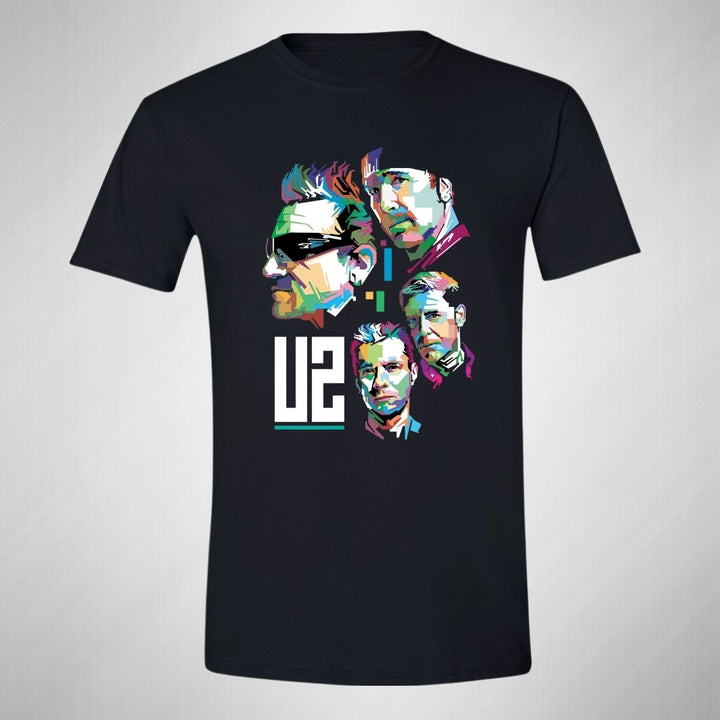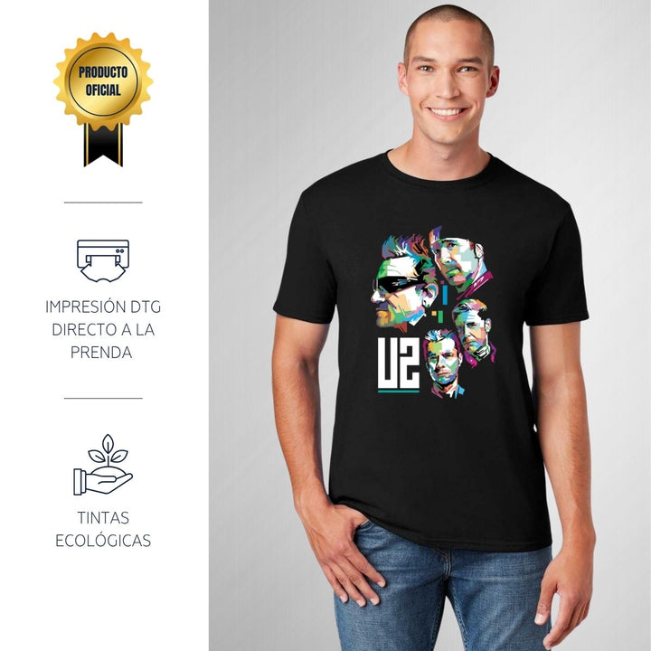 Playera de adulto manga corta, cuello redondo para hombre nueva, diseño U2 Ilustración original impreso con tecnología DTG (directo a la prenda) tacto cero, uso casual o deportiva, 100% algodón peinado, estructura tubular sin costuras laterales. Colores de camiseta para caballero: Negro.