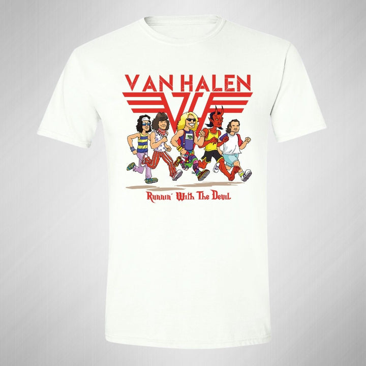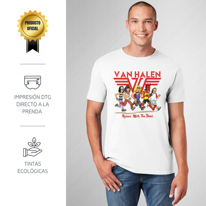 Playera de adulto manga corta, cuello redondo para hombre nueva, diseño Van Halen Running with the devil original impreso con tecnología DTG (directo a la prenda) tacto cero, uso casual o deportiva, 100% algodón peinado, estructura tubular sin costuras laterales. Colores de camiseta para caballero: Blanco.