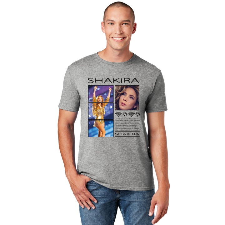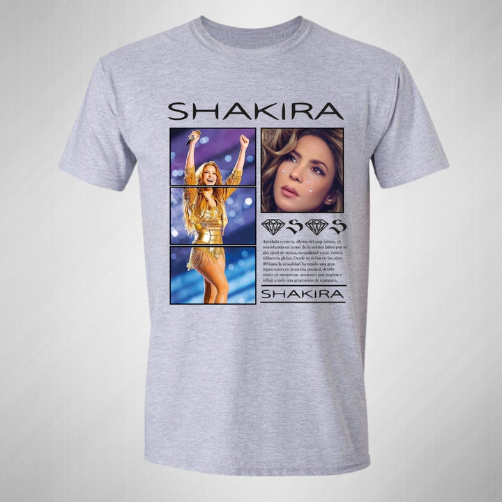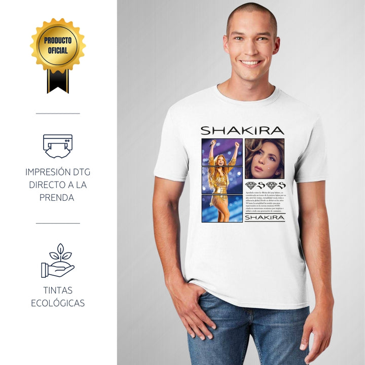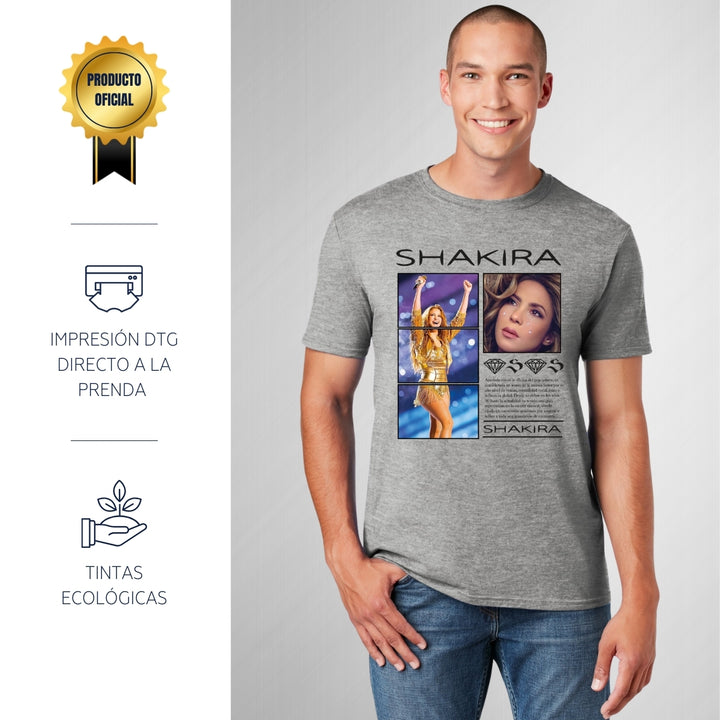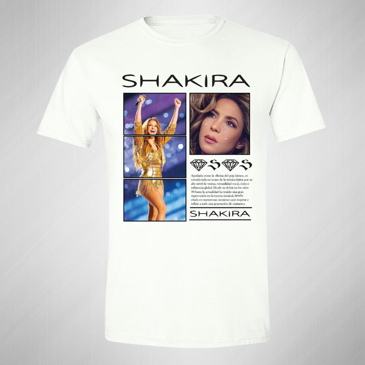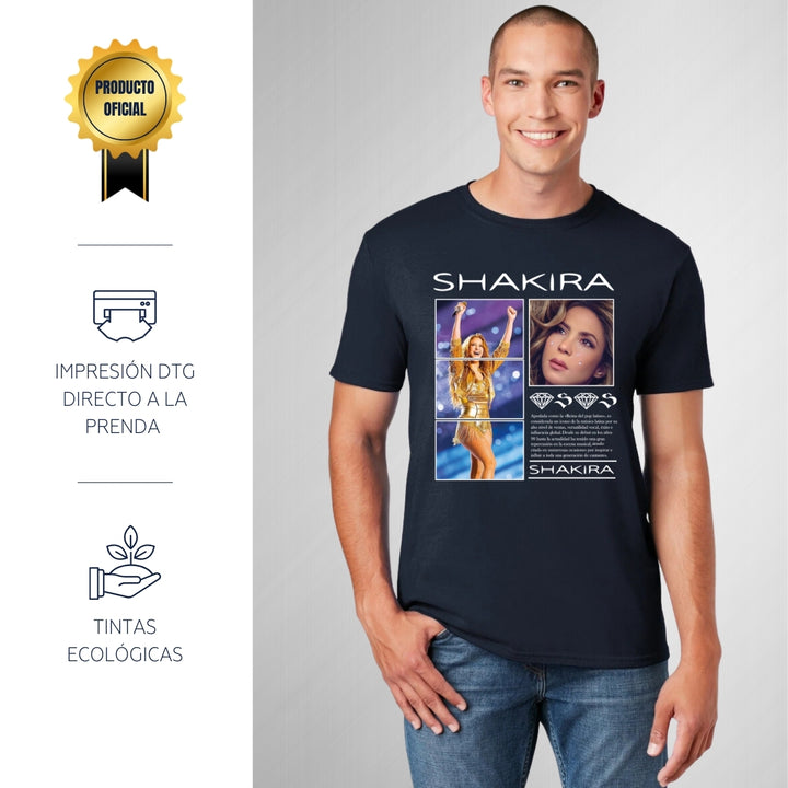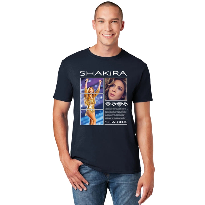 Playera de adulto manga corta, cuello redondo para hombre nueva, diseño Shakira Reyna del Pop Latino original impreso con tecnología DTG (directo a la prenda) tacto cero, uso casual o deportiva, 100% algodón peinado, estructura tubular sin costuras laterales. Colores de camiseta para caballero: Blanco, Negro, Azul Marino, Gris.