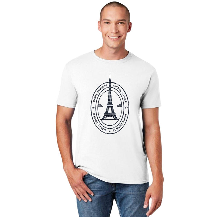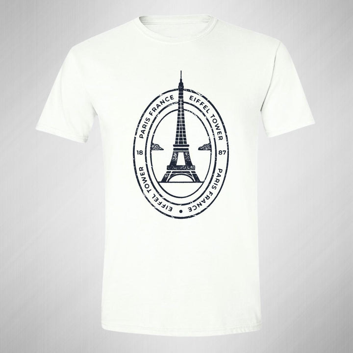 Playera de adulto manga corta, cuello redondo para hombre nueva, diseño Torre Eiffel Paris Francia original impreso con tecnología DTG (directo a la prenda) tacto cero, uso casual o deportiva, 100% algodón peinado, estructura tubular sin costuras laterales. Colores de camiseta para caballero: Blanco.