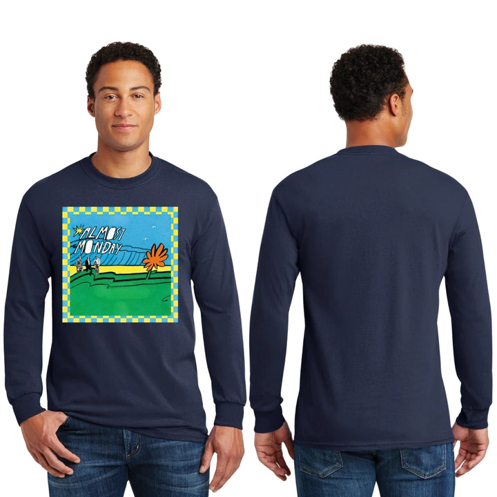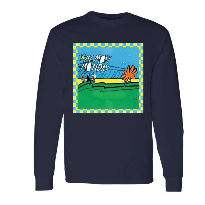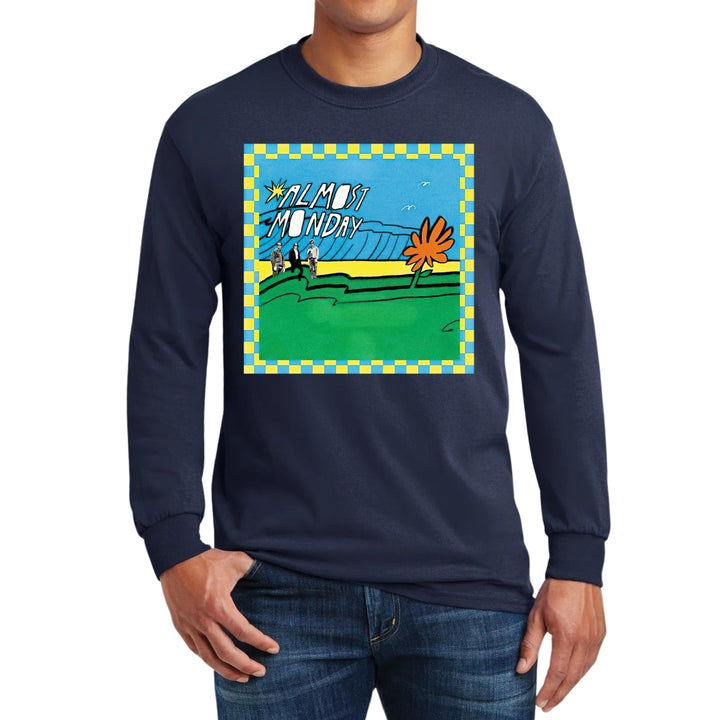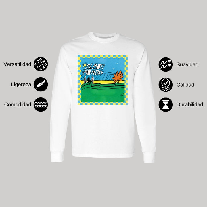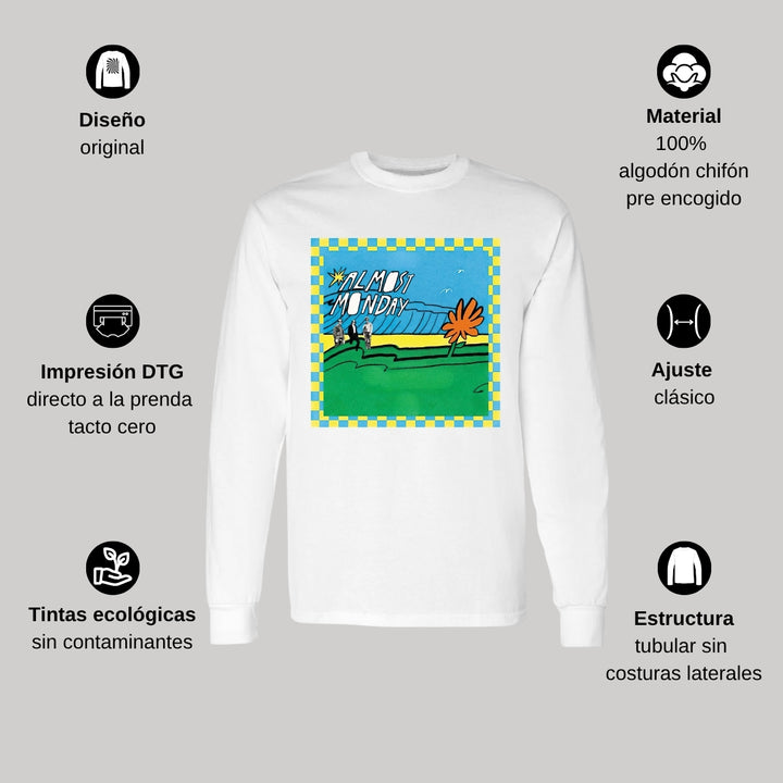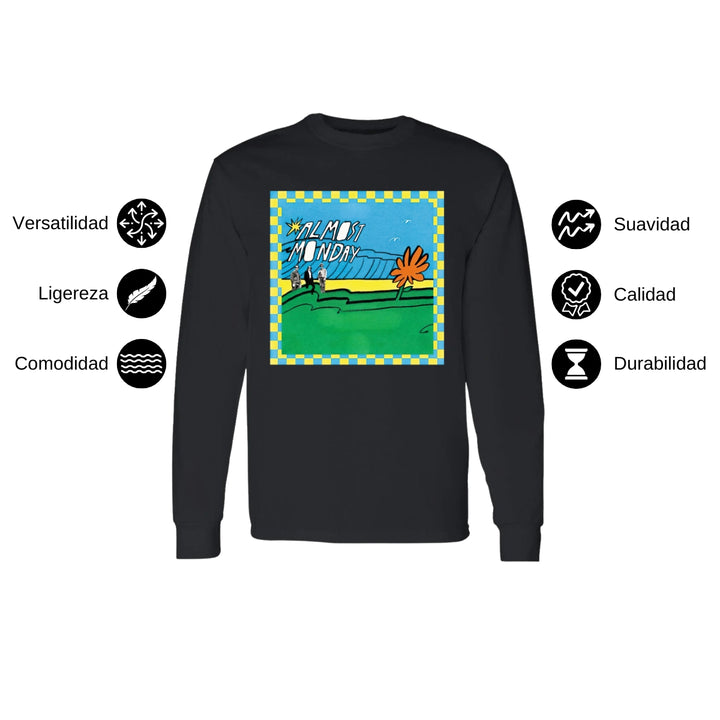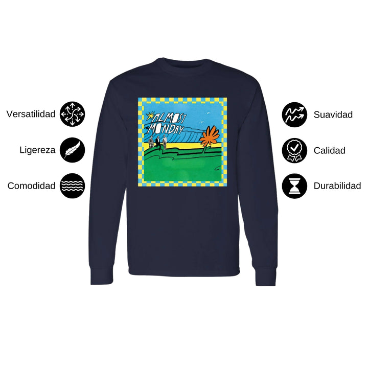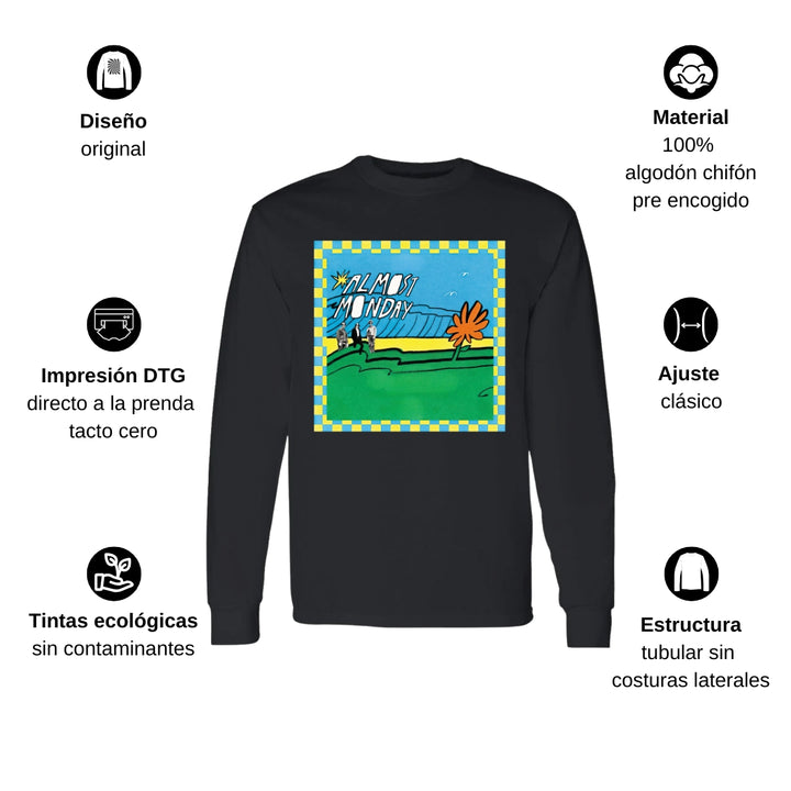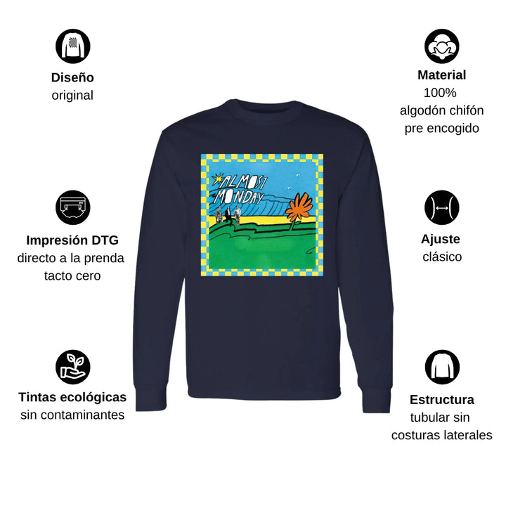 Playera de adulto manga larga, cuello redondo para hombre nueva, diseño Almost Monday Tour original impreso con tecnología DTG (directo a la prenda) tacto cero, uso casual o deportiva, 100% algodón chifón pre encogido, estructura tubular sin costuras laterales. Colores de camiseta para caballero: Negro, Blanco, Azul Marino.