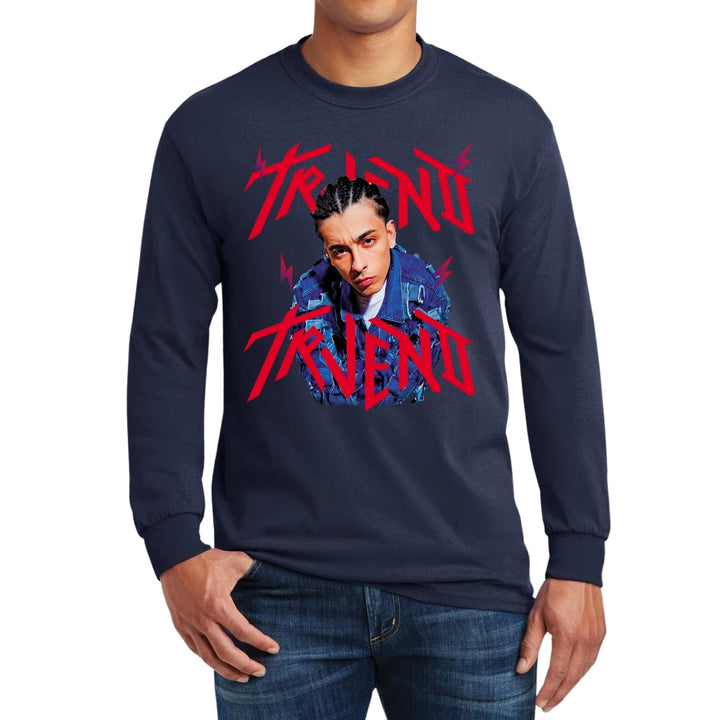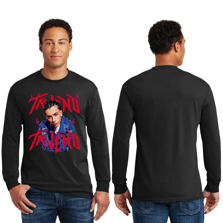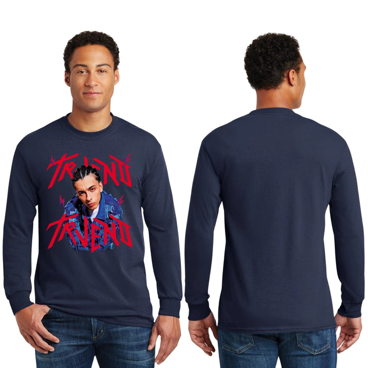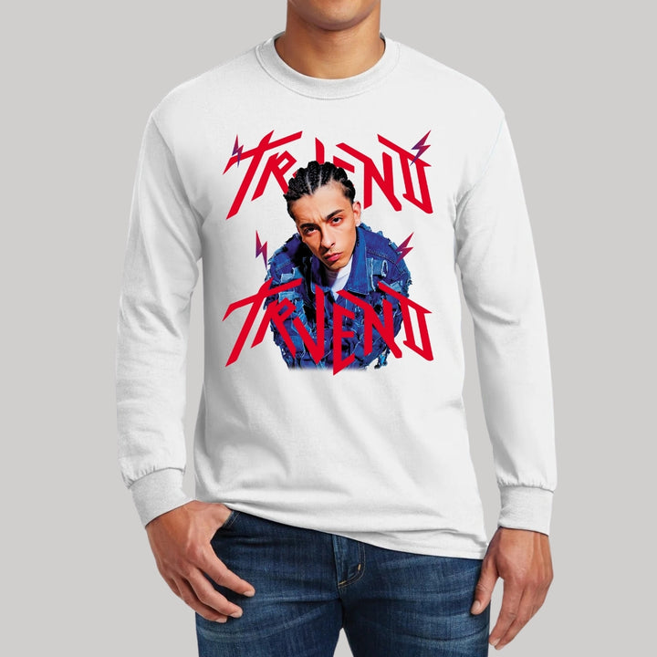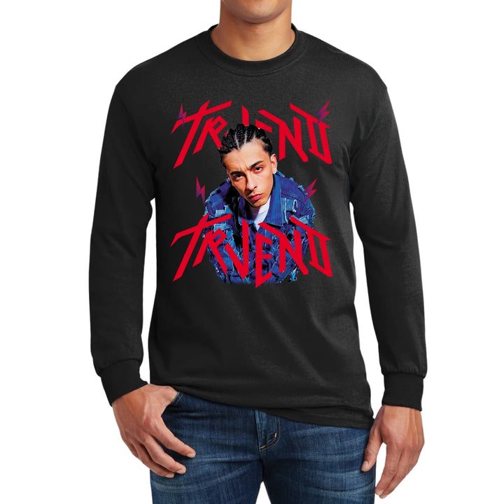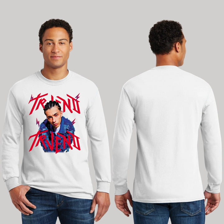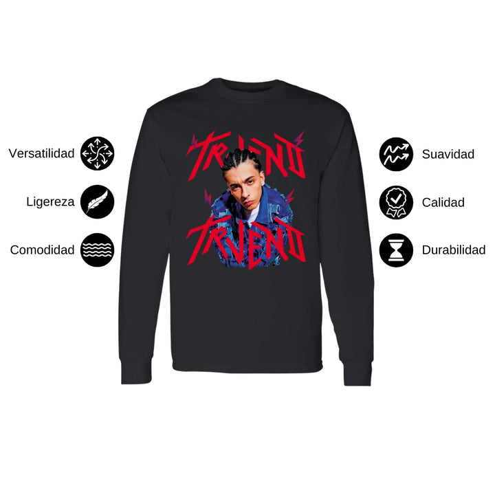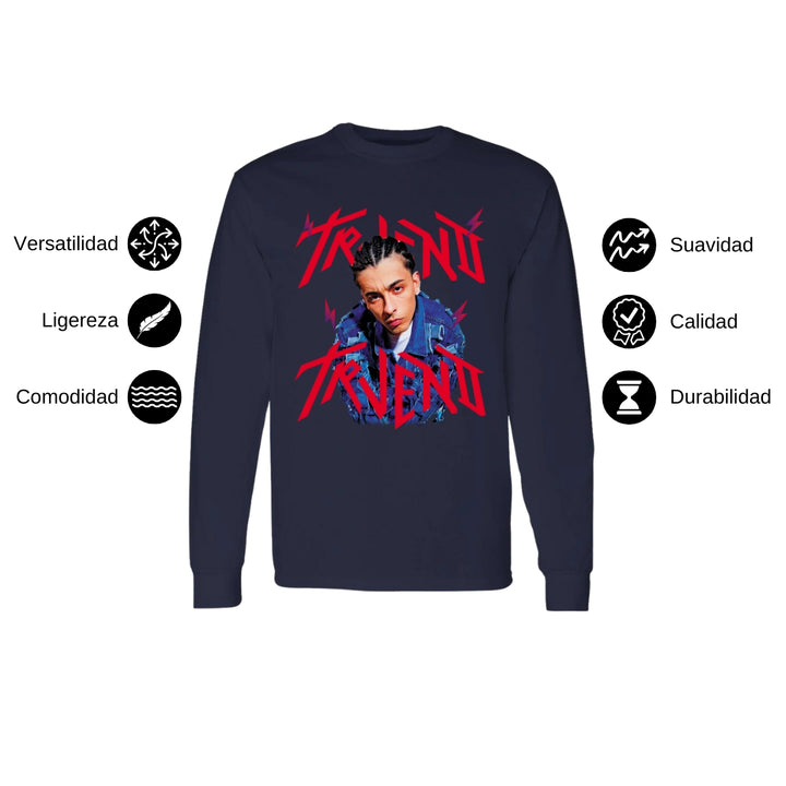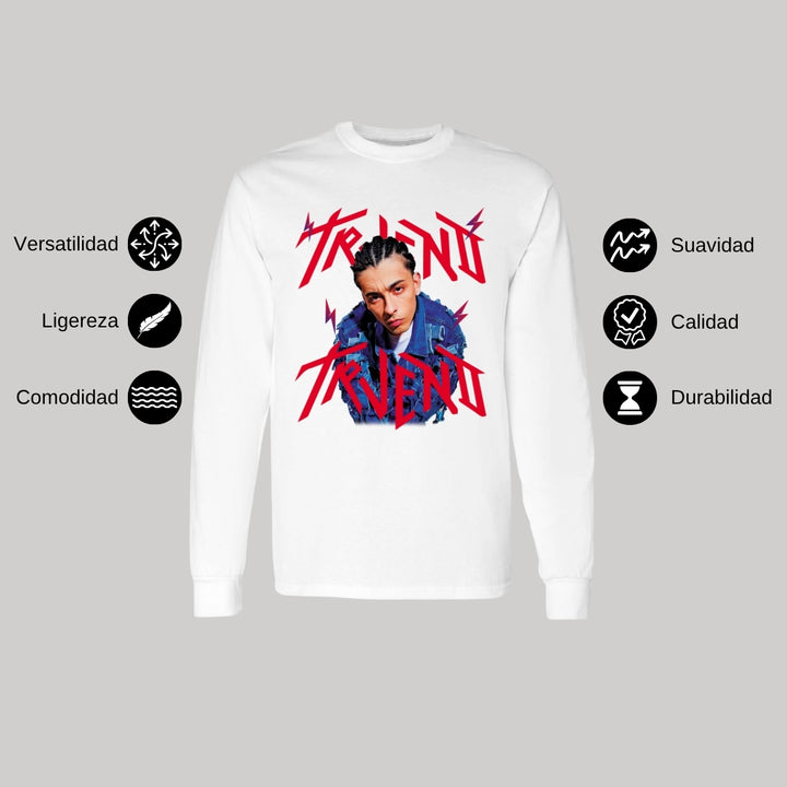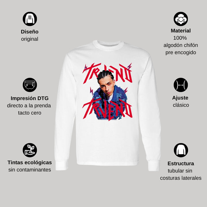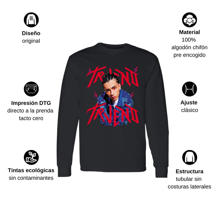 Playera de adulto manga larga, cuello redondo para hombre nueva, diseño Trueno Cantante Rapero original impreso con tecnología DTG (directo a la prenda) tacto cero, uso casual o deportiva, 100% algodón chifón pre encogido, estructura tubular sin costuras laterales. Colores de camiseta para caballero: Negro, Blanco, Azul Marino.