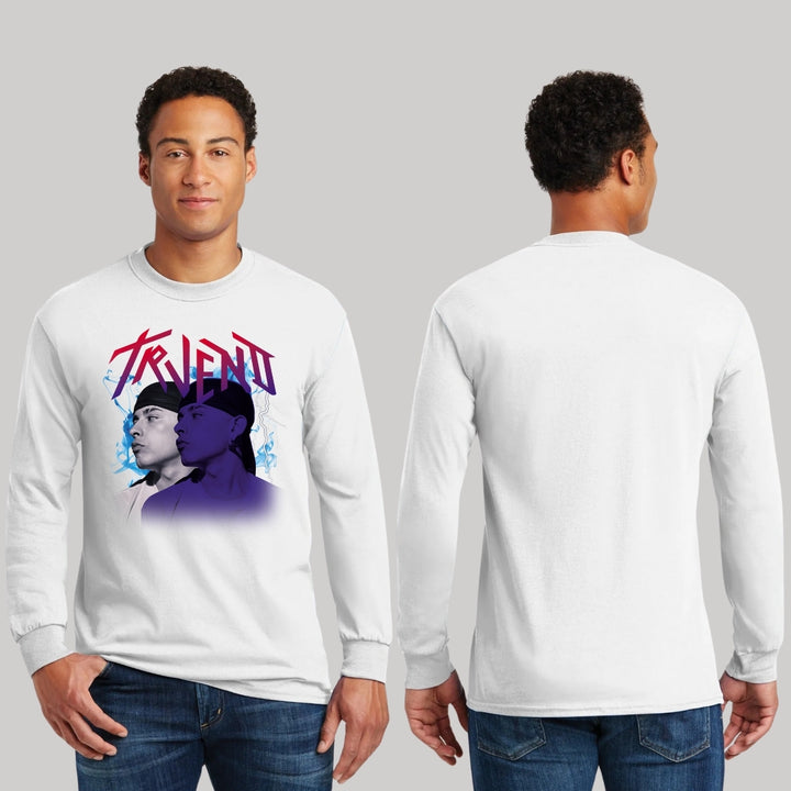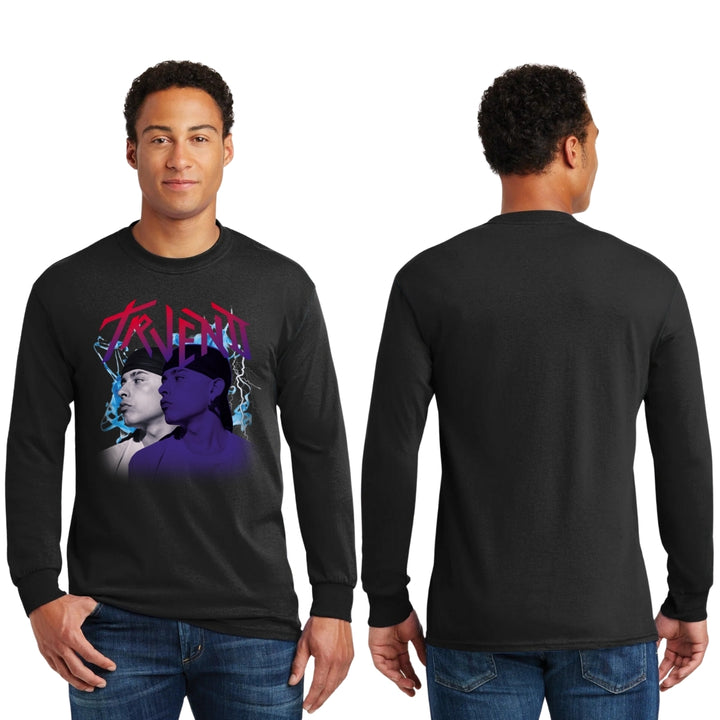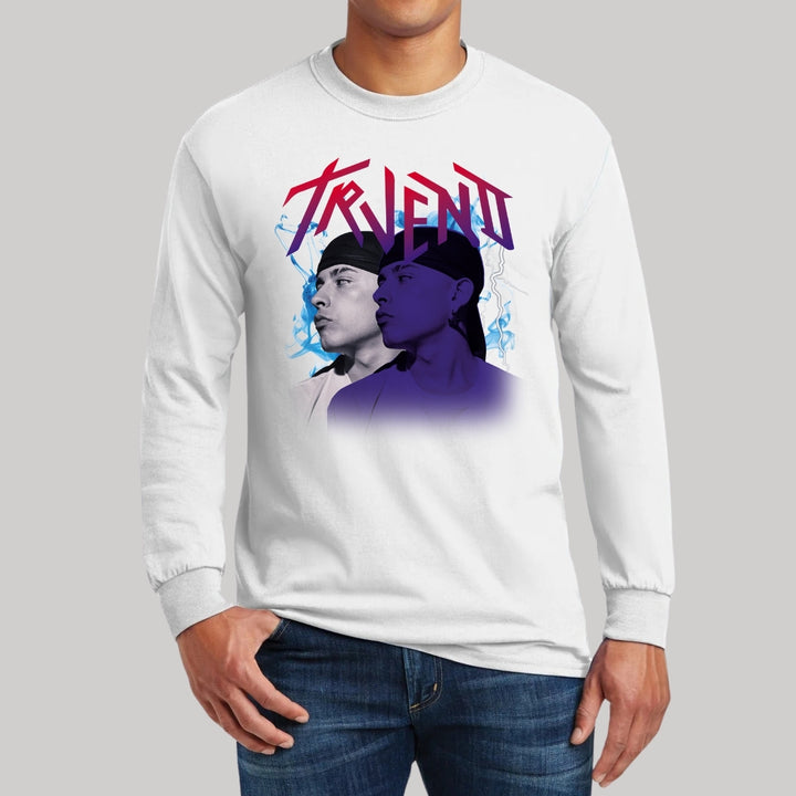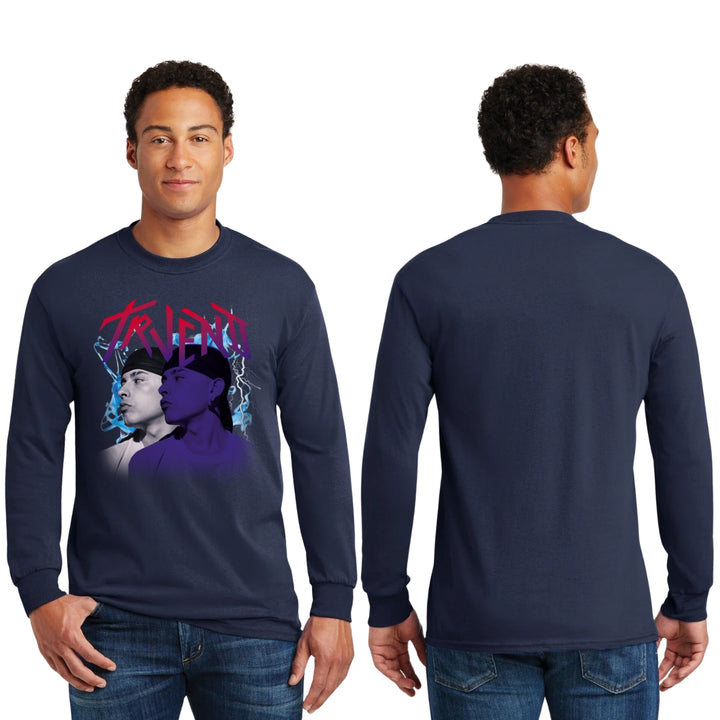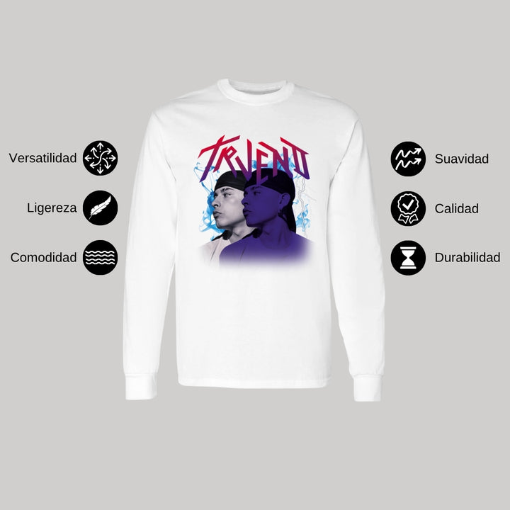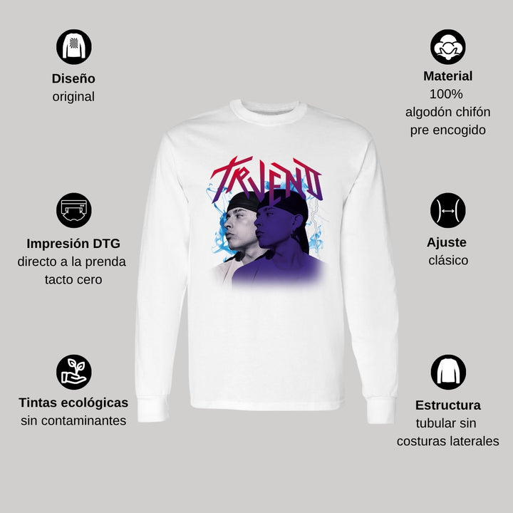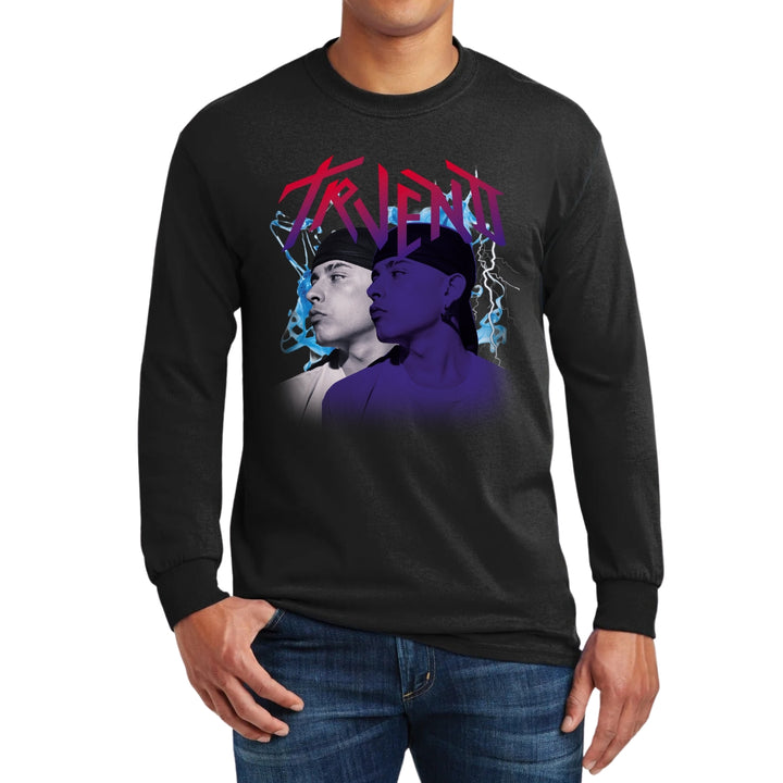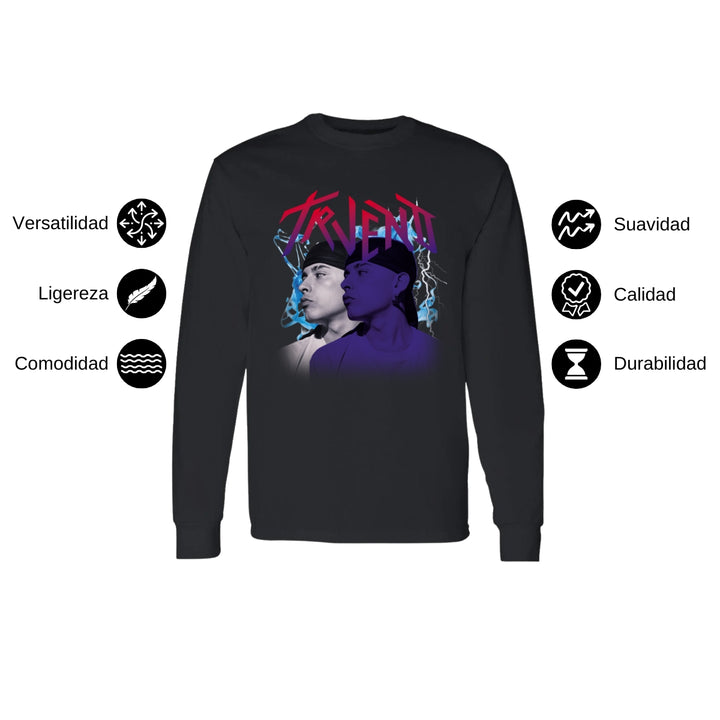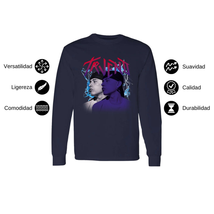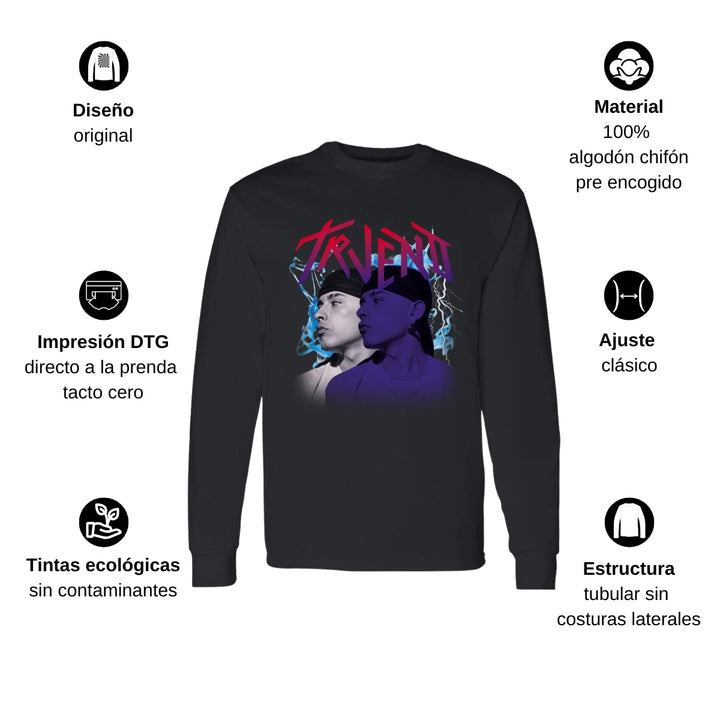 Playera de adulto manga larga, cuello redondo para hombre nueva, diseño Trueno Rapero Rap original impreso con tecnología DTG (directo a la prenda) tacto cero, uso casual o deportiva, 100% algodón chifón pre encogido, estructura tubular sin costuras laterales. Colores de camiseta para caballero: Negro, Blanco, Azul Marino.
