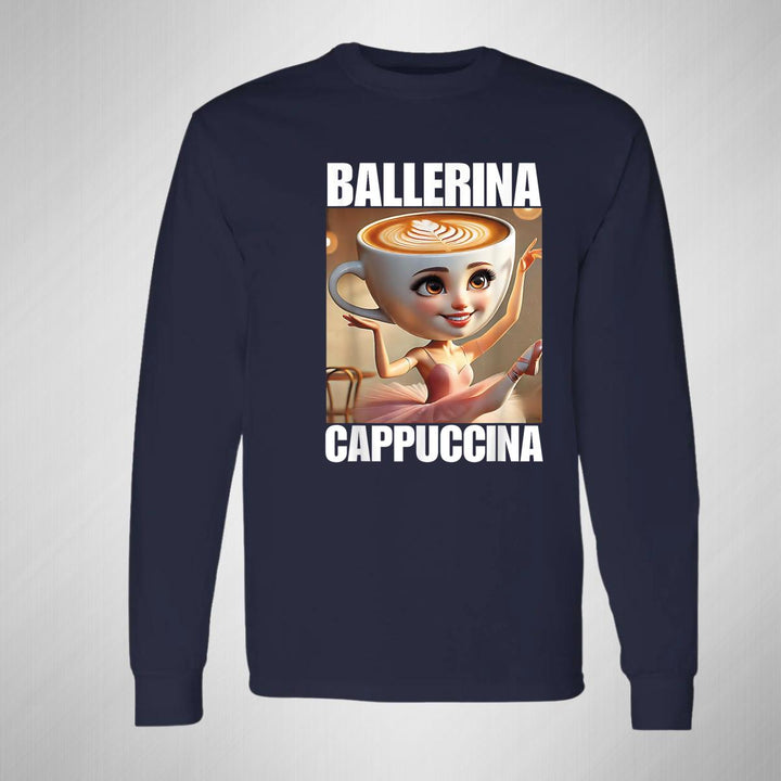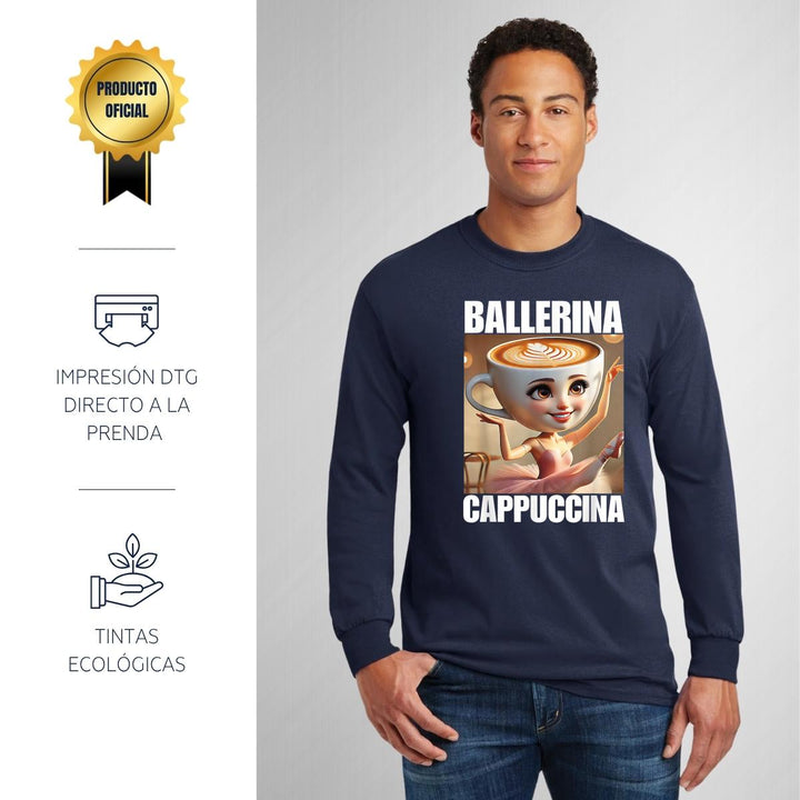 Playera de adulto manga larga, cuello redondo para hombre nueva, diseño Brainrot Ballerina Capuchina original impreso con tecnología DTG (directo a la prenda) tacto cero, uso casual o deportiva, 100% algodón chifón pre encogido, estructura tubular sin costuras laterales. Colores de camiseta para caballero: Negro, Azul Marino.