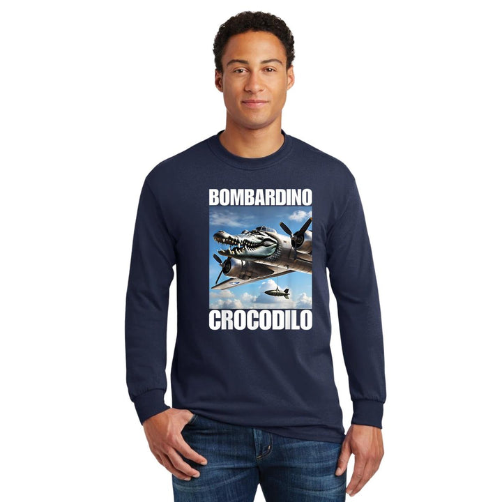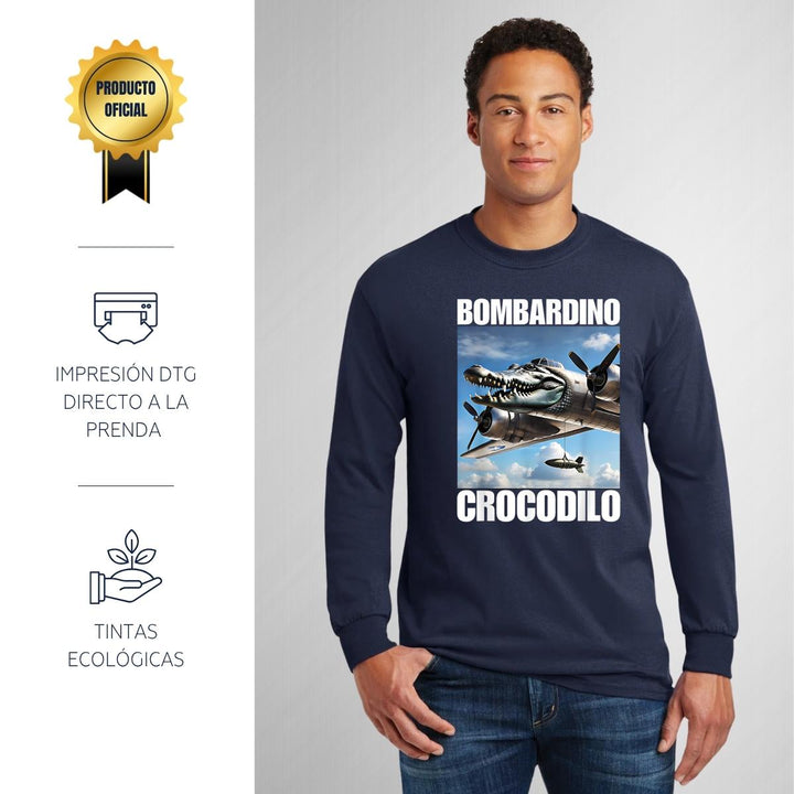 Playera de adulto manga larga, cuello redondo para hombre nueva, diseño Brainrot Bombardino Cocodrilo original impreso con tecnología DTG (directo a la prenda) tacto cero, uso casual o deportiva, 100% algodón chifón pre encogido, estructura tubular sin costuras laterales. Colores de camiseta para caballero: Negro, Azul Marino.