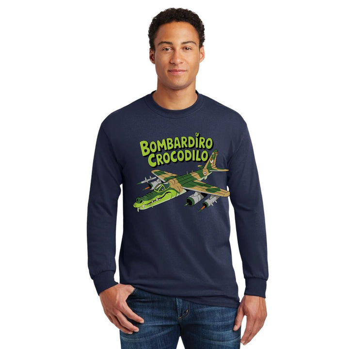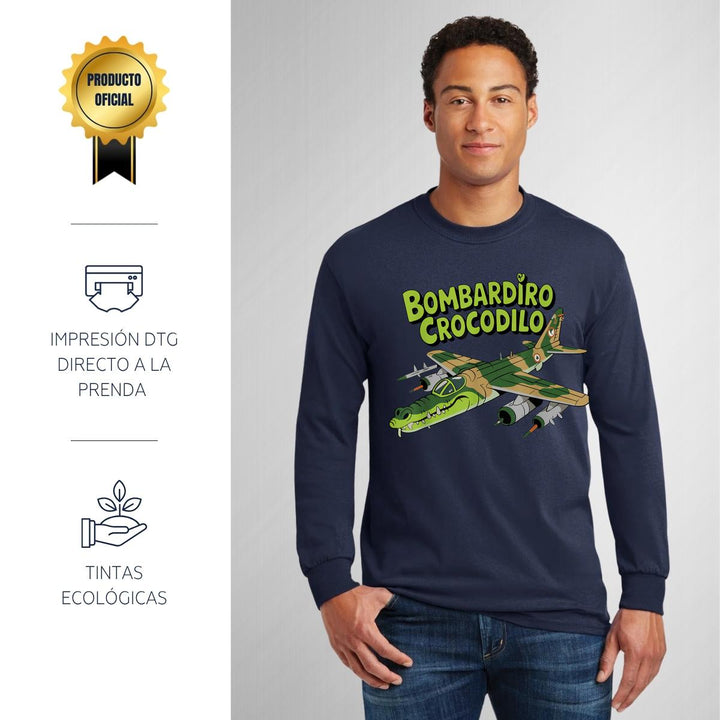 Playera de adulto manga larga, cuello redondo para hombre nueva, diseño Brainrot Bombardiro Crocodilo original impreso con tecnología DTG (directo a la prenda) tacto cero, uso casual o deportiva, 100% algodón chifón pre encogido, estructura tubular sin costuras laterales. Colores de camiseta para caballero: Negro, Blanco, Azul Marino.