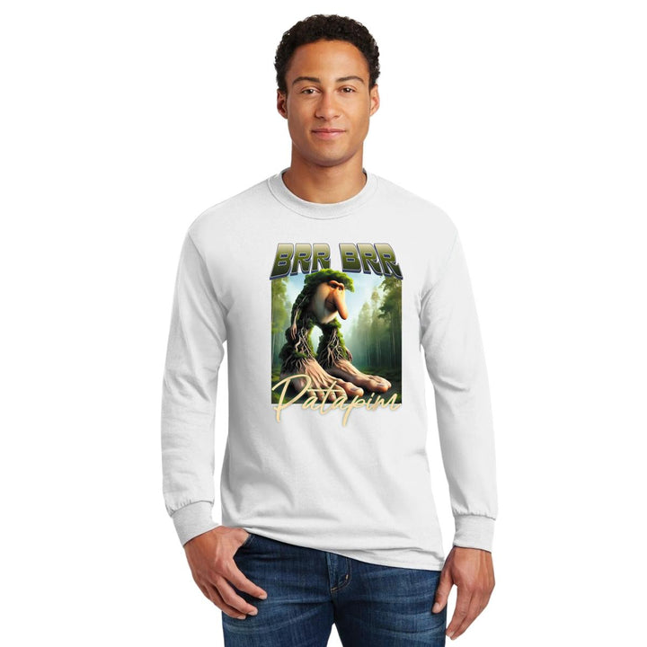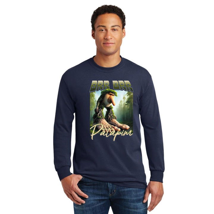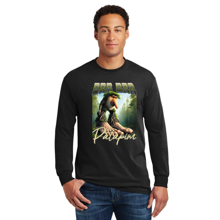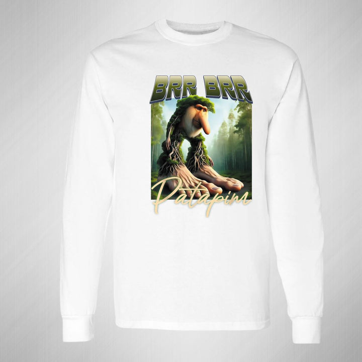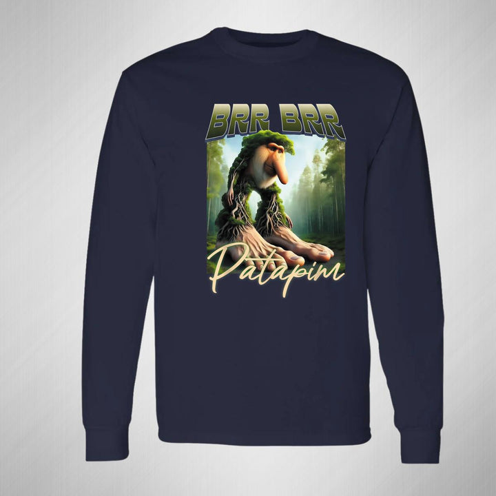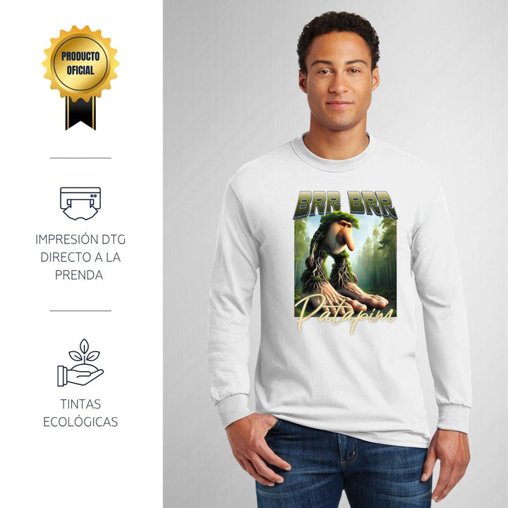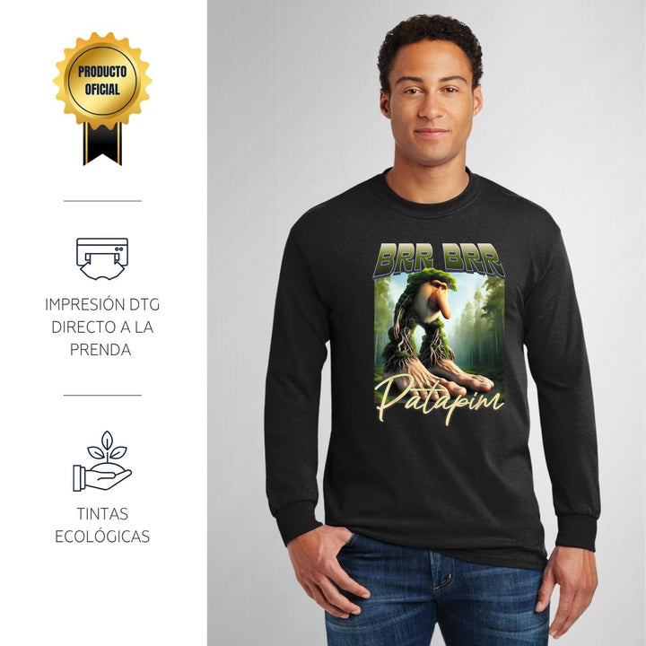 Playera de adulto manga larga, cuello redondo para hombre nueva, diseño Brainrot Brr Brr Patapim original impreso con tecnología DTG (directo a la prenda) tacto cero, uso casual o deportiva, 100% algodón chifón pre encogido, estructura tubular sin costuras laterales. Colores de camiseta para caballero: Negro, Blanco, Azul Marino.