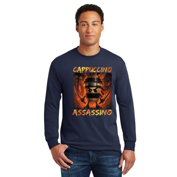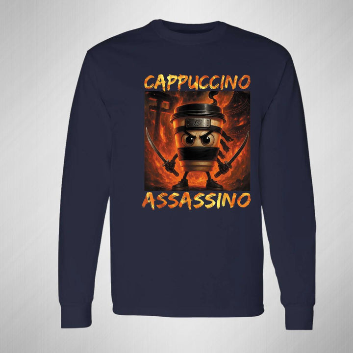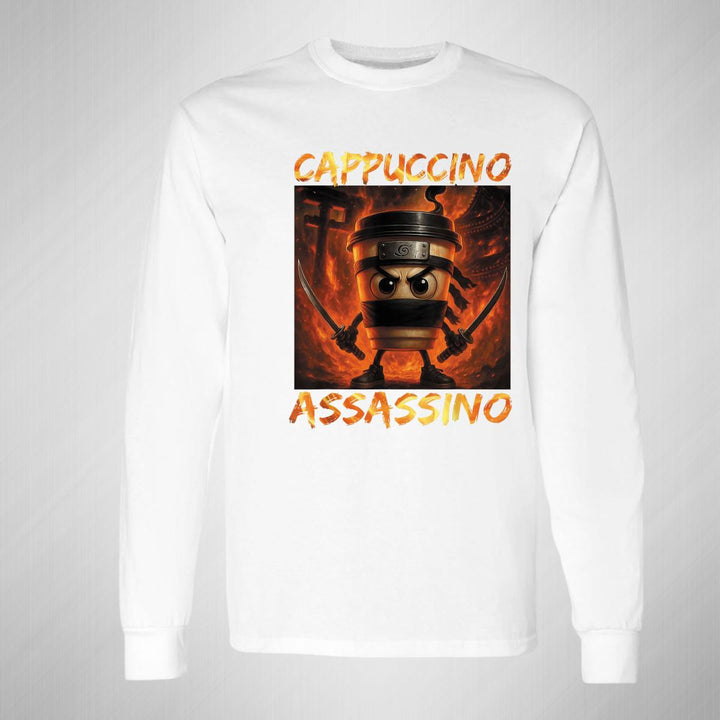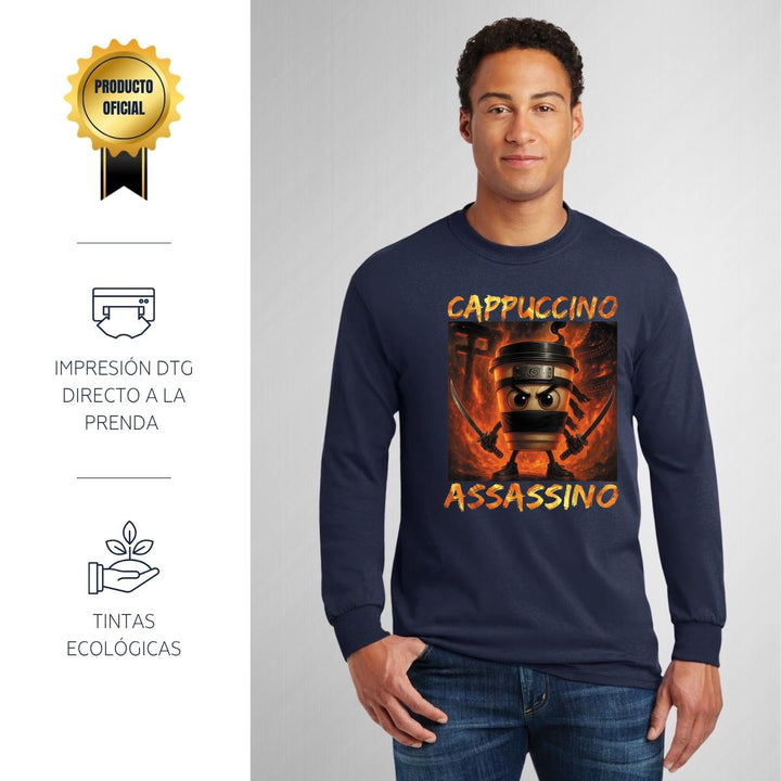 Playera de adulto manga larga, cuello redondo para hombre nueva, diseño Brainrot Cappuccino Assassino original impreso con tecnología DTG (directo a la prenda) tacto cero, uso casual o deportiva, 100% algodón chifón pre encogido, estructura tubular sin costuras laterales. Colores de camiseta para caballero: Negro, Blanco, Azul Marino.